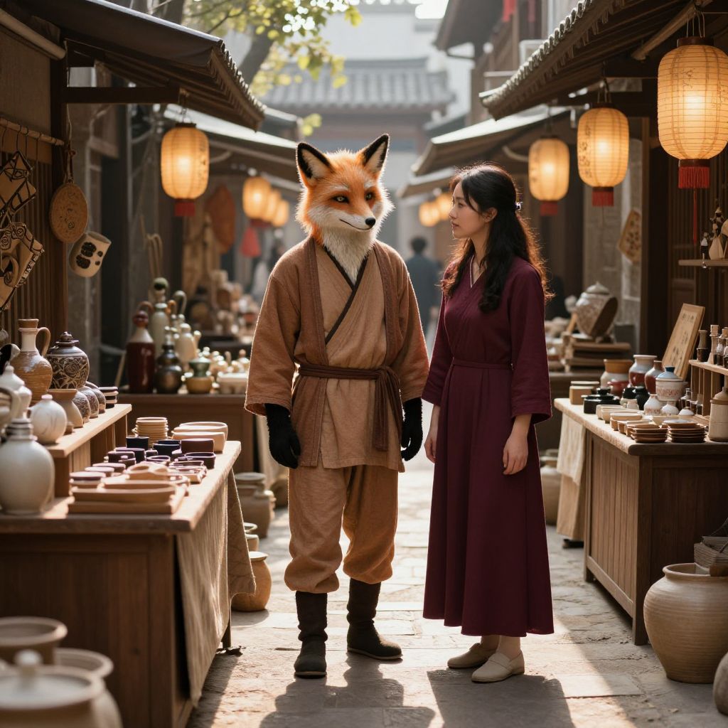 Photograph of a narrow, sunlit Asian market alley with wooden stalls on both sides displaying various pottery and ceramics. A humanoid fox in a brown traditional kimono with black gloves and boots stands facing a woman with long black hair in a deep purple long dress. The fox has orange fur, a white muzzle, and black-tipped ears. Warm paper lanterns hang above the stalls, casting a soft glow. The background shows more market stalls and a hint of greenery. The scene blends realistic and whimsical elements, creating a magical, historical atmosphere.