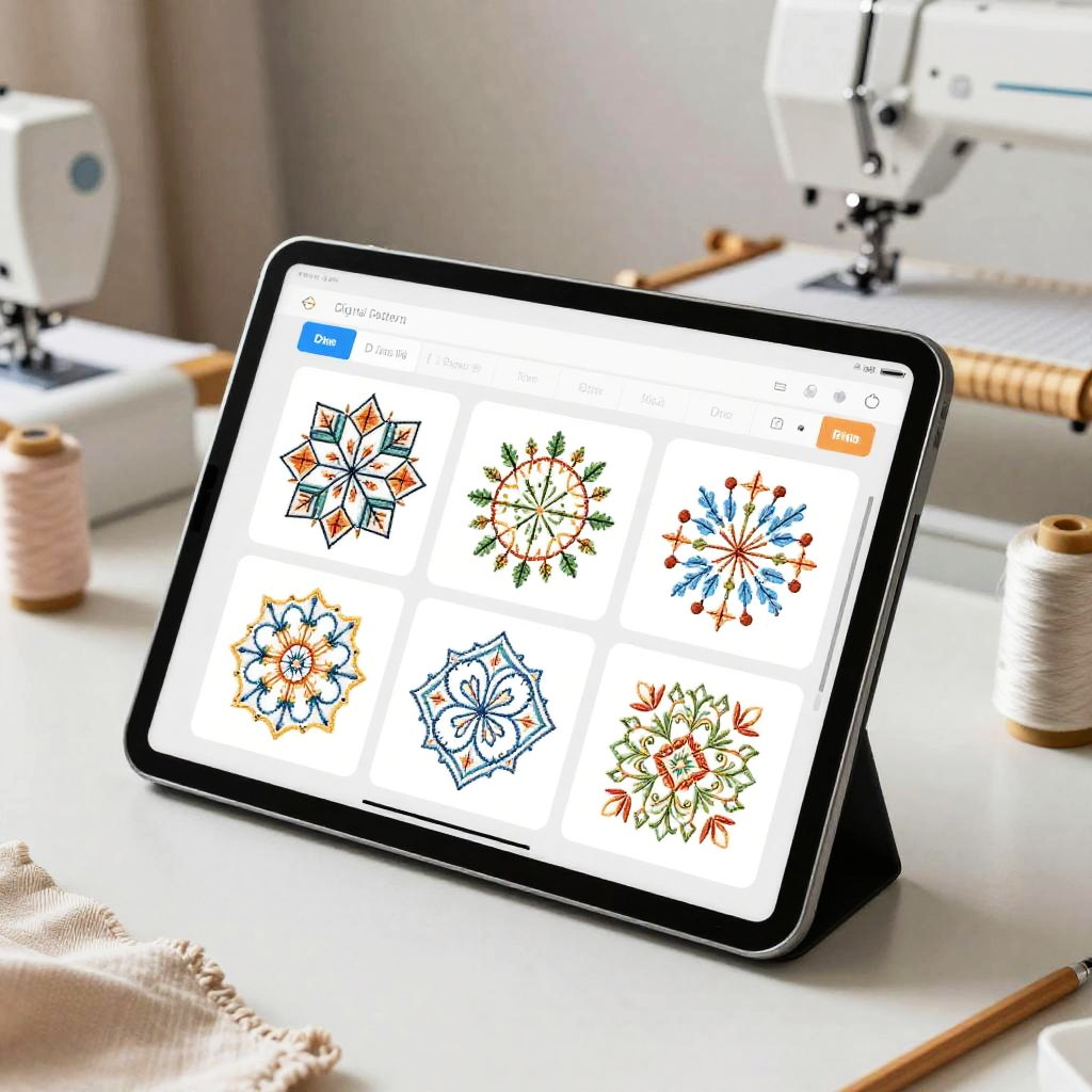 Digital embroidery pattern maker interface displayed on a sleek tablet, showcasing complex geometric and floral design options, with a modern workspace featuring sewing tools, threads, and fabrics, futuristic but cozy environment.