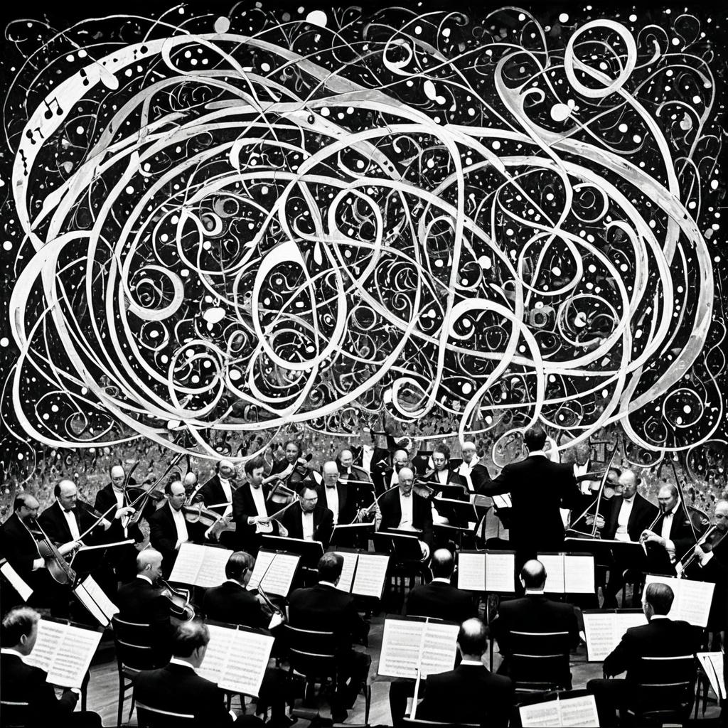 Black and white photograph of a formal symphony orchestra with musicians in tuxedos playing string instruments. The image is superimposed with complex painted abstract triadic flourishes weaving in and out of the orchestra in the style of Jackson Pollock, creating a dynamic and energetic collage.