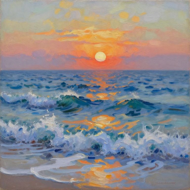 Impressionist-style painting of a vibrant sunset over a turbulent ocean, with orange sun reflecting on choppy blue waves and foamy white surf.