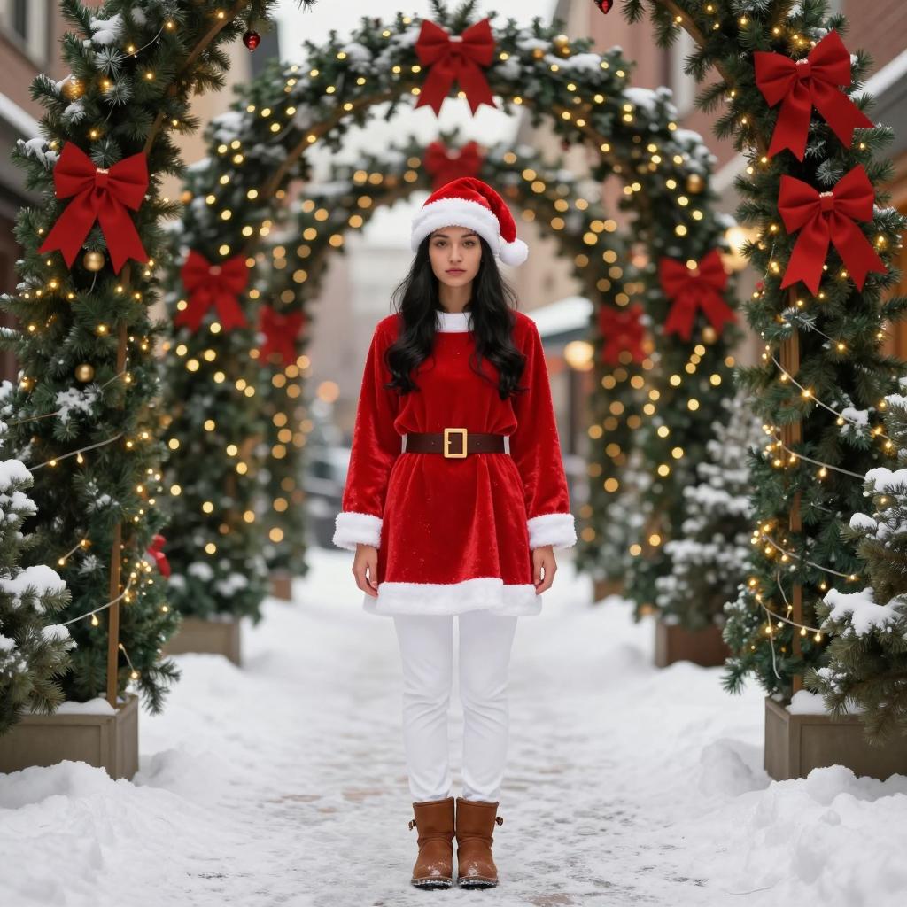 Young Woman in Festive Winter Outfit in Snowy Park