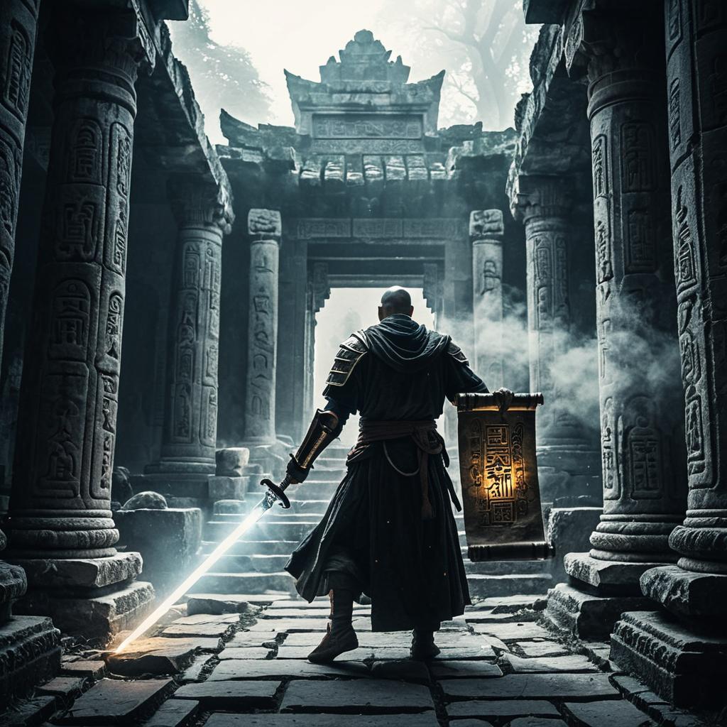 A dramatic action scene featuring a secretive master chef in a chaotic, fiery kitchen at midnight, with flames dancing off a skillet as she flips a sizzling ingredient adding to the intrigue,