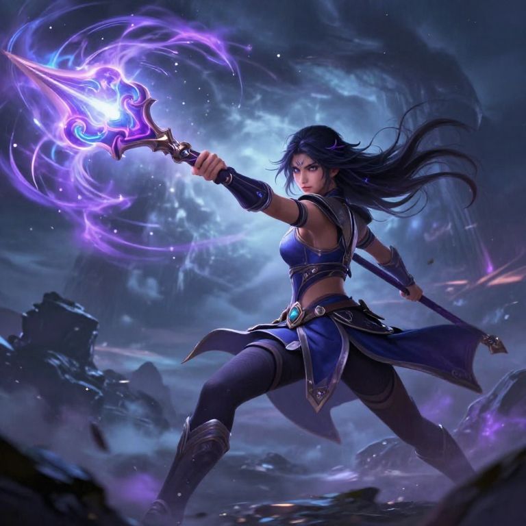 Dynamic action scene of Ranni's body wielding a magical staff, casting spells with swirling energy in a stormy landscape, intense blue and violet hues, semi-realistic style capturing motion and power with high detail on attire and facial expression.
