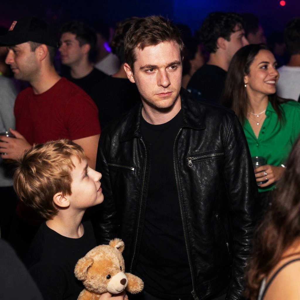 Photograph of a crowded nightclub. Central man in black leather jacket, brown hair, serious expression. Blonde boy with small teddy bear on left, looking up. Woman with green blouse, brown hair, smiling in background. Men in red shirts, black hats on left. Blurred lights and people in background.