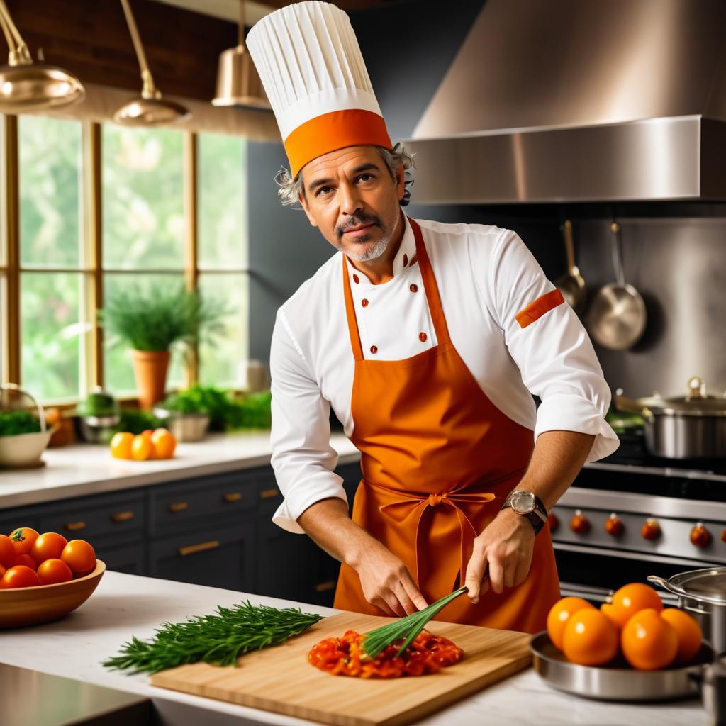 Gorgeous chef with a stylish apron, a chef's hat, and a delightful dish in a gourmet kitchen. Styled as fashion photography, with costume design influences by Alice Waters, Anthony Bourdain, cinematic color grading, and high detail, 8K.