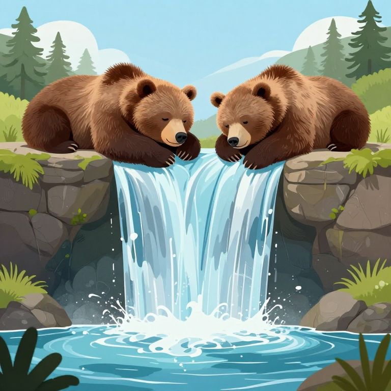 Two bears rest peacefully on a moss-covered cliff above a serene waterfall, their tranquil presence framed by ancient trees and cascading waters that reflect the ethereal beauty of a dreamlike forest.