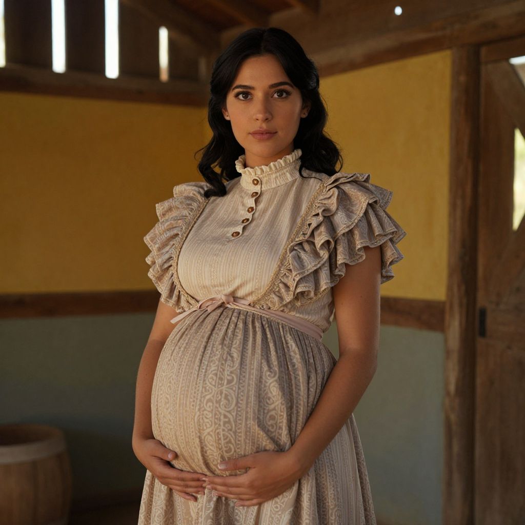 A cinematic portrait of a diverse woman with dark hair and almond-shaped eyes in a vintage-inspired maternity gown costume with a high collar and ruffled sleeves, posing inside a rustic barn during golden hour with wooden beams and painted walls in warm tones.. The woman has big tits and cute face
