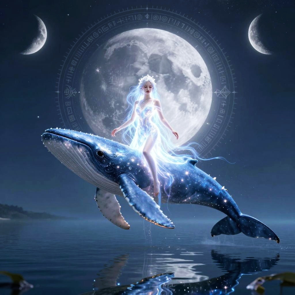 A aetheric skywhale featuring an luminous being set against a backdrop of mirror-lake beneath twin moons. Surrounded by intricate patterns and ancient symbols, this scene conveys a sense of wonder, beautifully illuminated to highlight its flawless features.