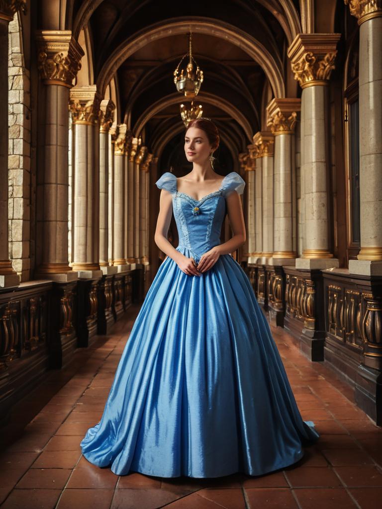 Woman in Elegant Blue Cinderella Dress in Castle Corridor