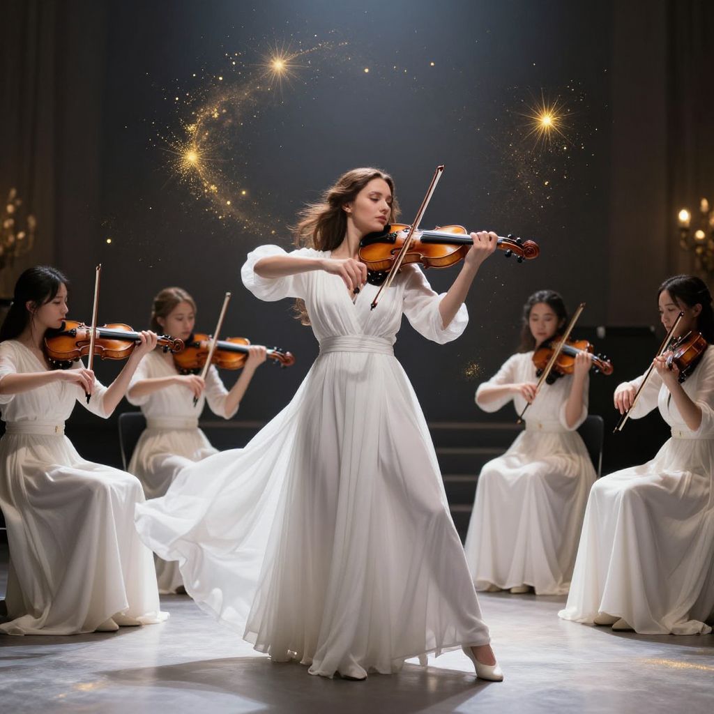 A woman in flowing white attire passionately performs on a violin, surrounded by a circle of similarly dressed musicians, as golden sparks float ethereally around them in a mystical, dreamlike setting.
