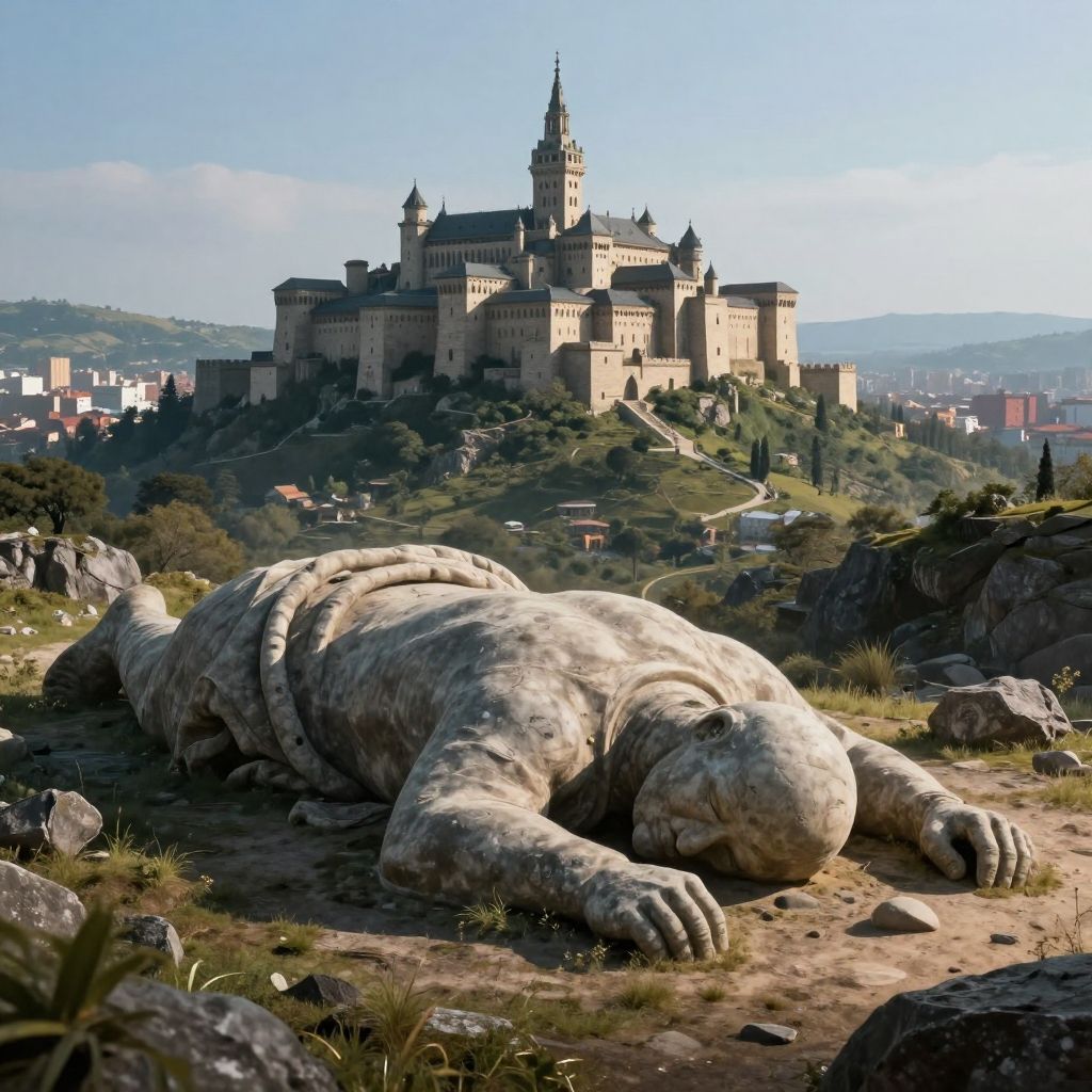 This photograph-like CGI image depicts a massive, stone-like, humanoid creature lying face down on a rocky, grassy hill in the foreground. The creature's textured, gray stone skin contrasts with the green and brown landscape. In the background, a grand, medieval-style castle with multiple towers and a central spire sits atop a hill, surrounded by smaller buildings and lush greenery. The sky is clear with soft sunlight illuminating the scene, casting gentle shadows. The castle's architecture and the creature's imposing presence create a fantastical, almost surreal atmosphere.