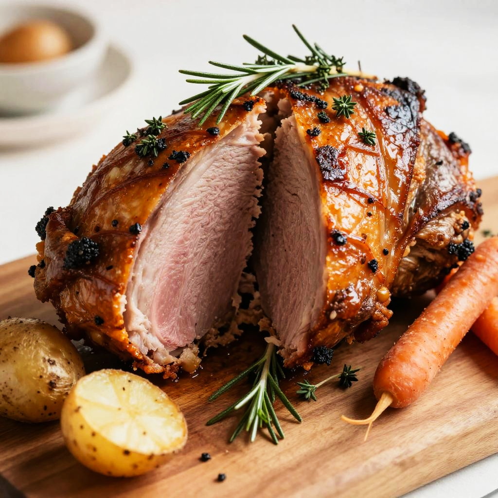 Close-up of a perfectly cooked split roast with a crispy exterior and tender inside, garnished with rosemary and thyme, served on a wooden board with roasted potatoes and carrots