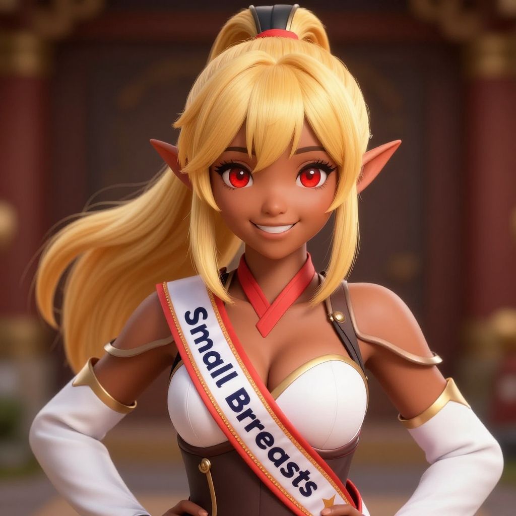 Digital anime-style character with dark skin, blonde hair, red eyes, elf ears, and large breasts wearing a "Shemale" sash, smiling