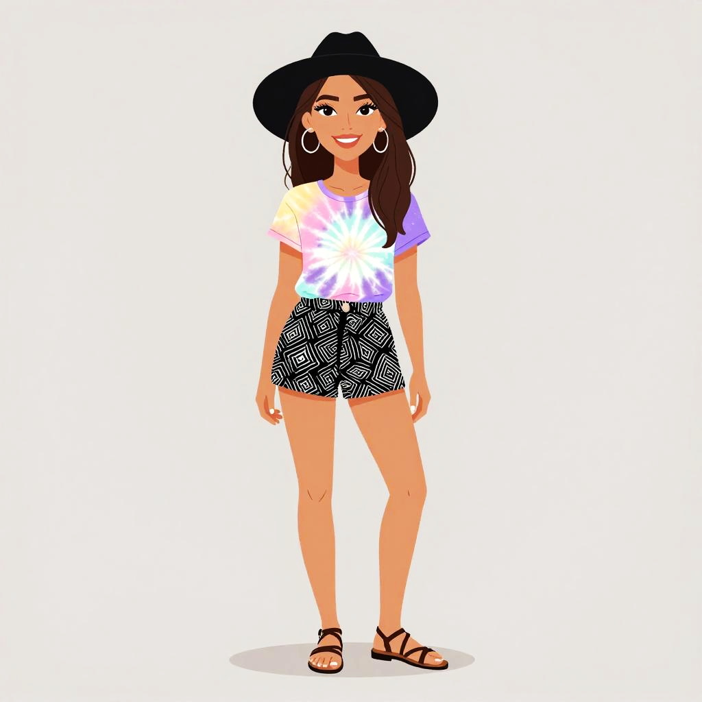 Digital illustration of a smiling woman with light brown skin and brown hair, wearing a blue sundress with white floral patterns, a black wide-brimmed hat, large hoop earrings, and a blue bracelet on her right wrist. She stands against a solid lavender background, with her left hand resting by her side and her right hand slightly raised. The style is vibrant and cartoonish, with bold colors and clean lines. The woman's dress is sleeveless and falls to mid-thigh, accentuating her casual, summery look.
