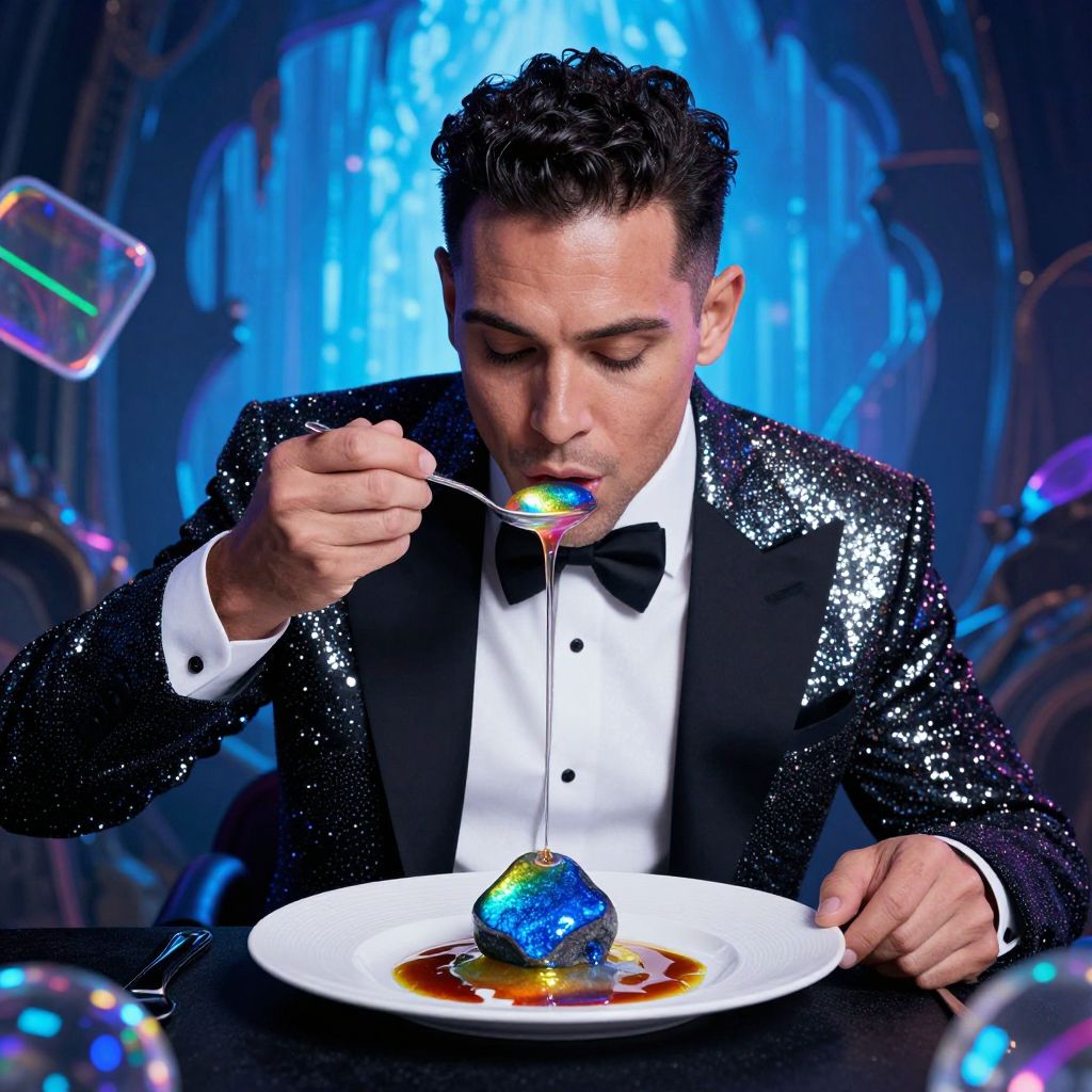 Photograph of a man in a sparkling black tuxedo, black bowtie, eating a colorful, iridescent sphere with a spoon, surrounded