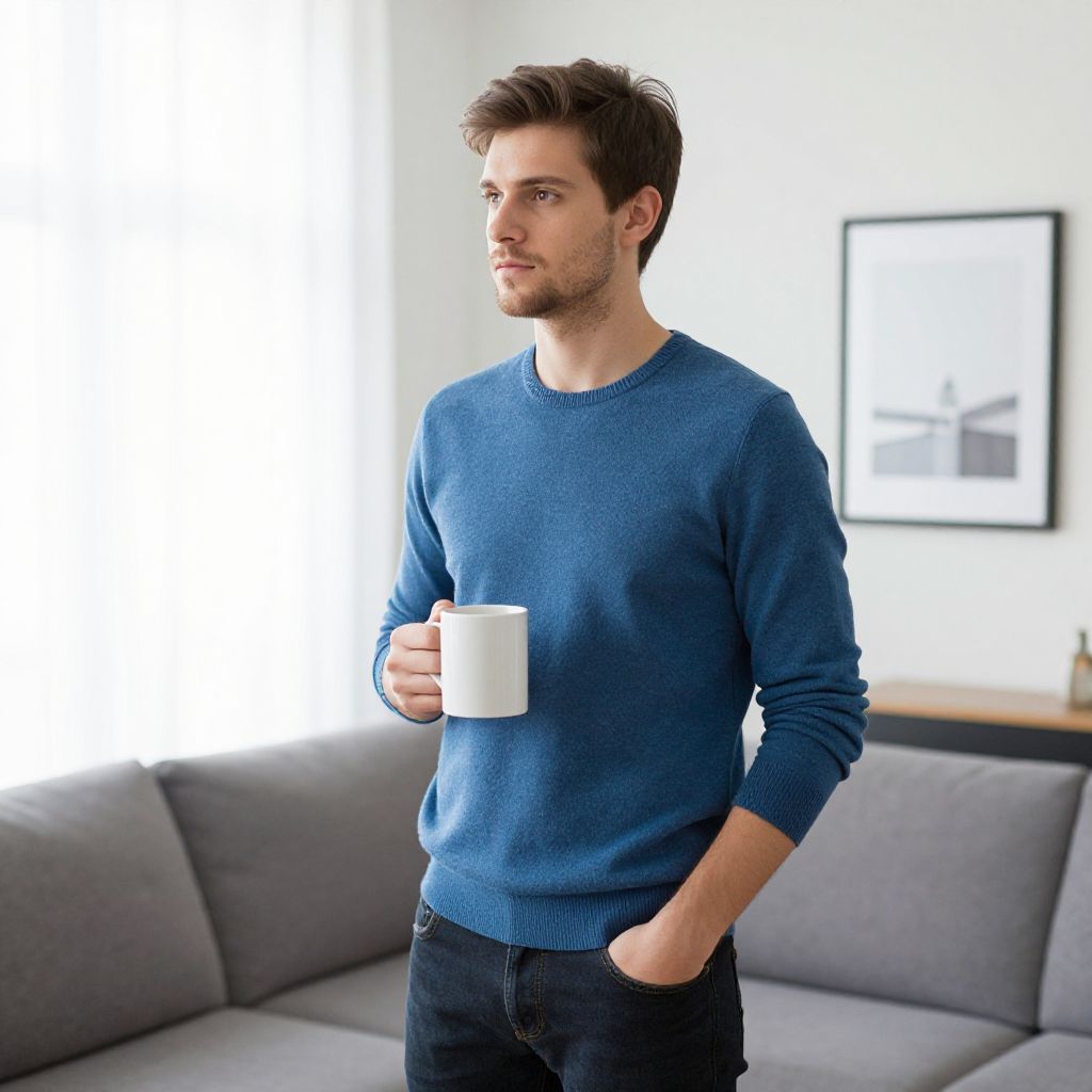 Photograph of a young Caucasian man with short brown hair and light beard, standing in a modern living room. He wears a blue, long-sleeve knit sweater and dark jeans, holding a white mug in his right hand. His left hand is in his pocket. He gazes to the left with a thoughtful expression. The background features a gray sectional sofa and a white wall with a black-framed abstract artwork. Bright natural light streams in from a window on the left, creating a soft, well-lit atmosphere.