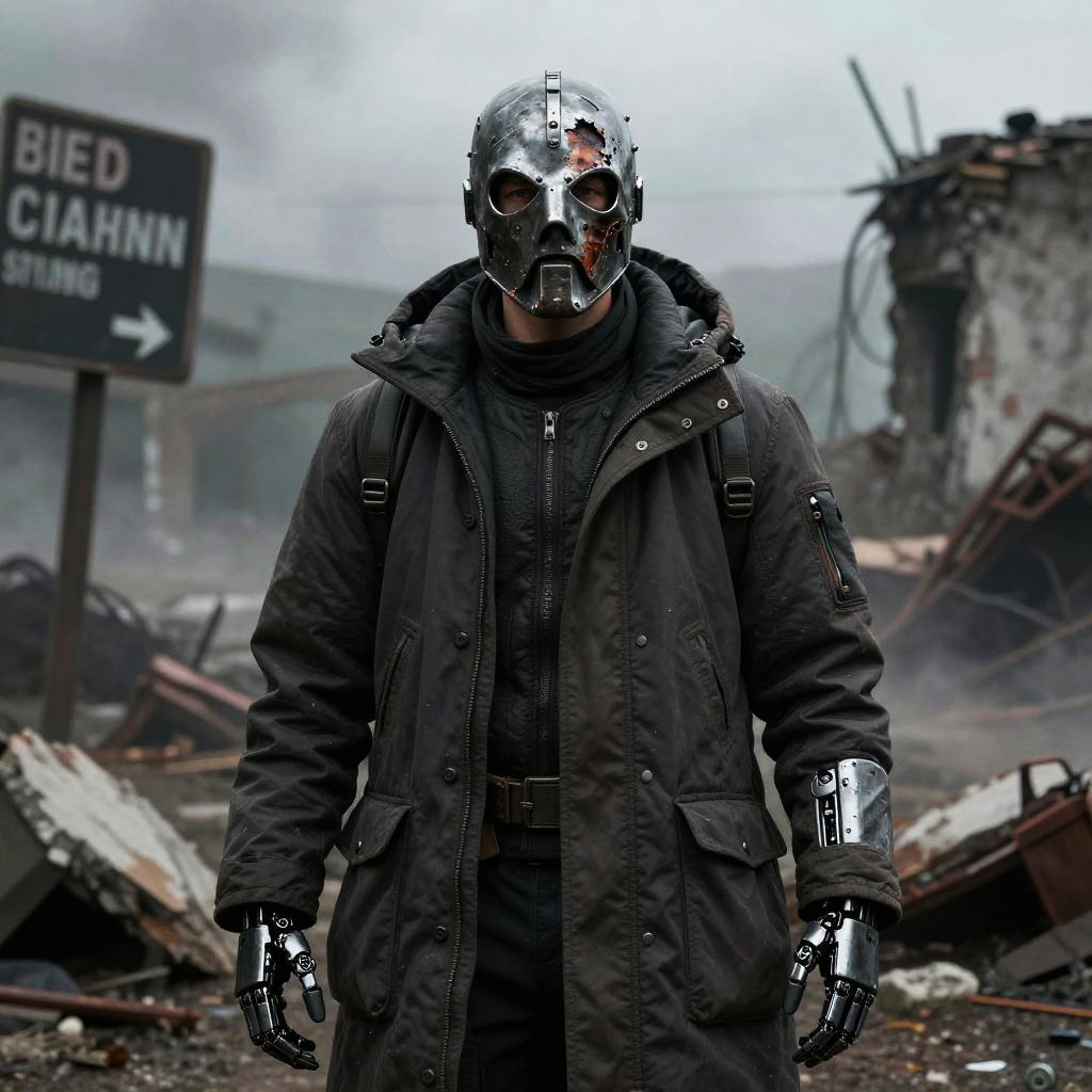 Exposure Bracketing sci-fi grimdark setting, seasoned male scout with scratched metal mask covering burnt cheek and partial robotic right forearm, wearing a heavy insulated dark charcoal parka, standing with a stoic expression with ruins and signs of warfare behind her