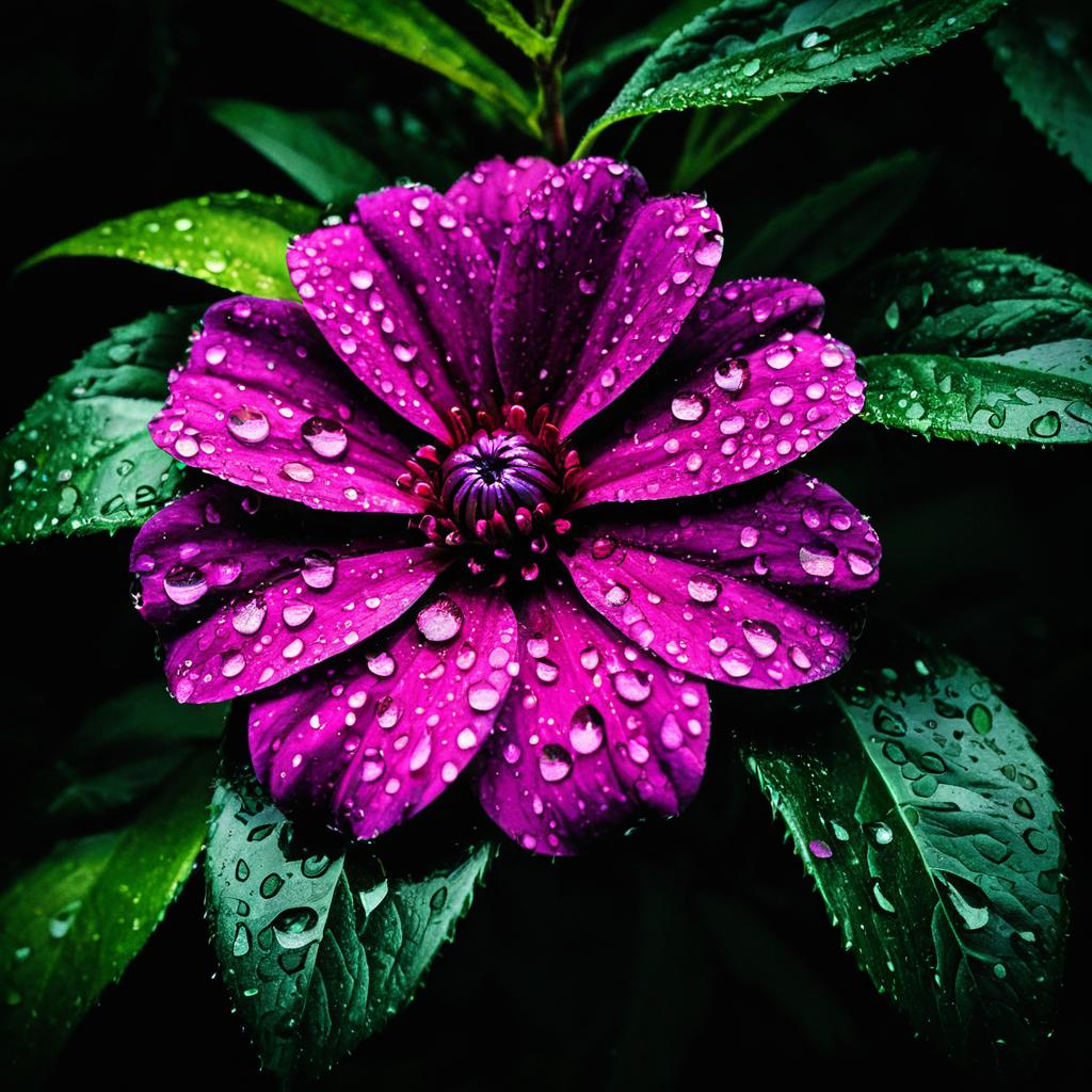 Close-up view of a vibrant magenta flower with detailed petals covered in realistic water droplets, surrounded by lush green leaves, high contrast lighting emphasizing natural texture and vivid colors, dark moody background enhancing the flower's bright magenta and green hues, ultra-realistic nature photography style
