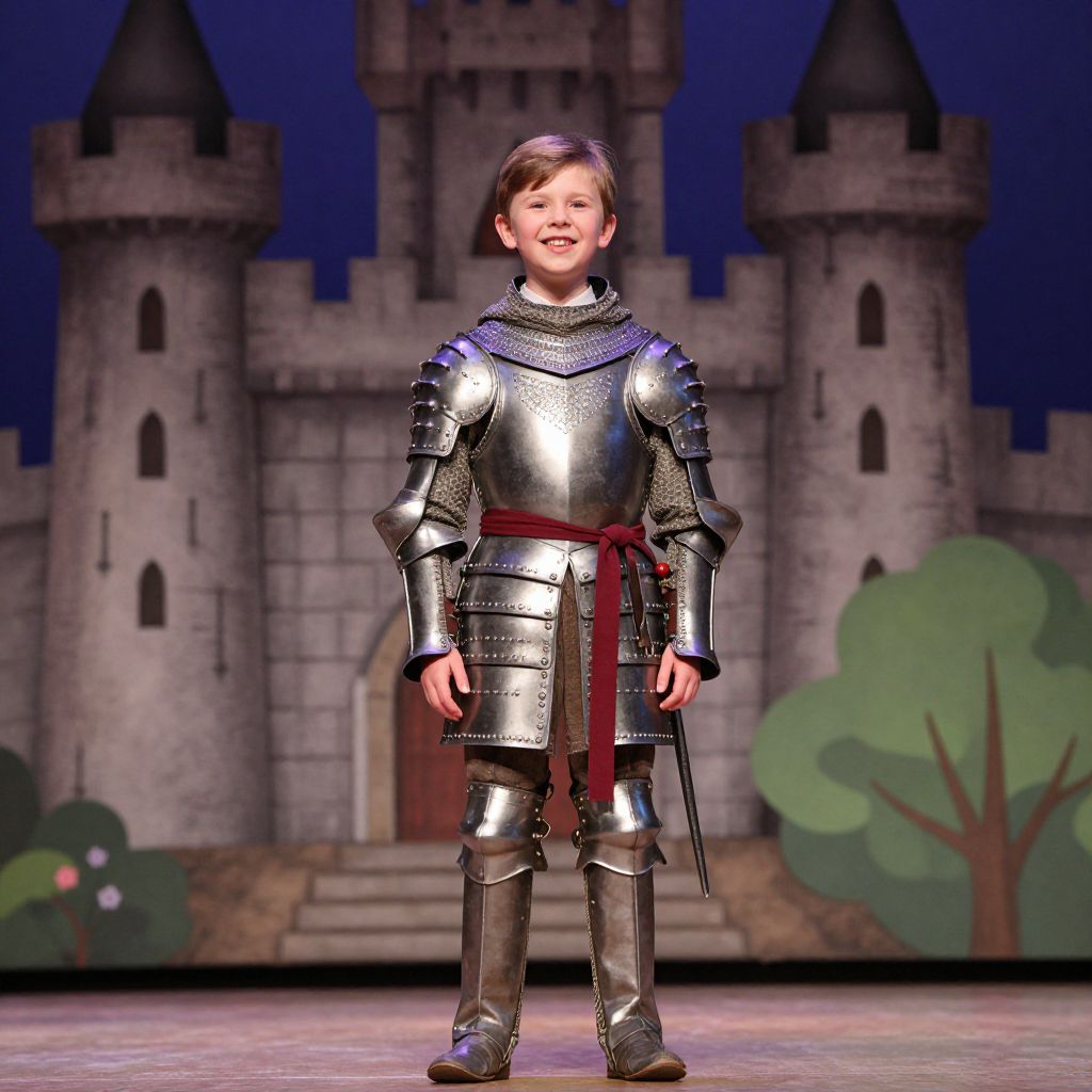 A child in a school play, wearing an appropriate costume of a medieval knight with a detailed, modest armor set and a simple red sash, standing in front of a painted castle backdrop in a school auditorium during a performance, with a wide, happy smile and focused expression.