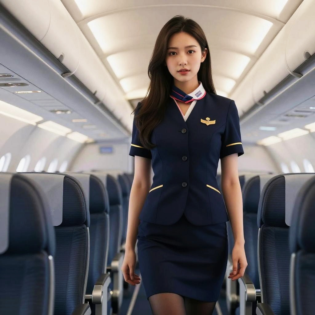 Best quality, masterpiece, 8k, ultra high res, (photorealistic:1.4), highly detailed, intricate detail, delicate and beautiful, good lighting, professional lighting, sharp focus, detailed shadows, exquisite details and textures, depth of field, unity 8k wallpaper, cinematic composition, cinematic lighting, official art, Cabin Crew, flight attendant, black pantyhose, (aircraft, (Aircraft Corridor), Aircraft seats)beautiful elegant face, detailed face, detailed eyes, realistic hair, long hair, (1girl), (standing:1.3), Sexy Pose