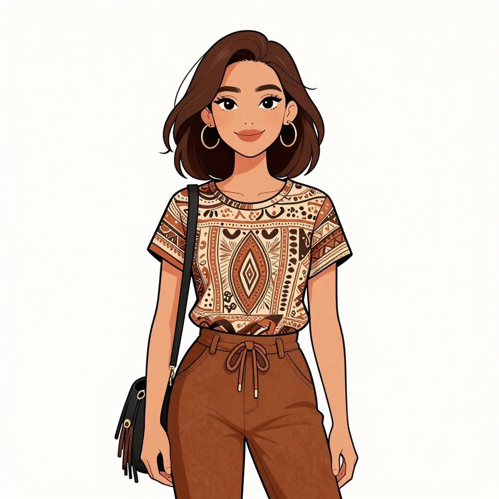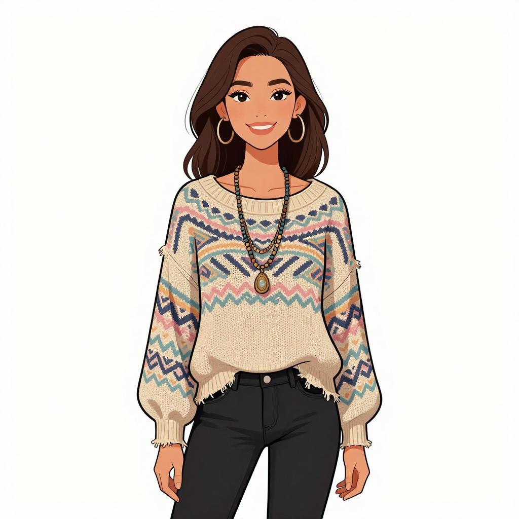 Woman with pretty face and pretty hair. smiling Woman, bohemian, loosely fitted knit sweater with a pastel tribal pattern, wide neckline, long sleeves, distressed hem, layered necklaces with beads and pendants, black skinny jeans. --sref 1467