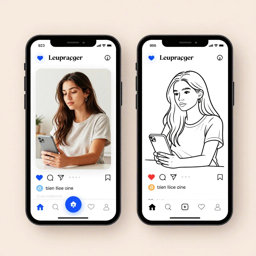 Photo to line art generator application in action, side-by-side display of a high-resolution photo and its elegant line art equivalent, realistic lighting with a tech-savvy creative workspace, emphasizing artistry and digital innovation, soft pastel tones