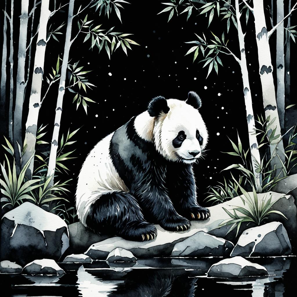 Hyperdetailed watercolor illustration of a panda sitting on rocks by a stream in a serene mountain forest environment. The scene features slender birch trees, green bamboo leaves, and a tranquil, minimalist Japanese-inspired style with a black background.