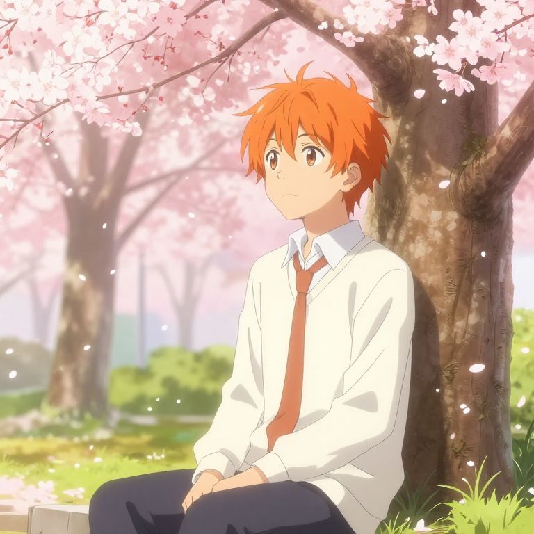 Anime boy with orange hair sitting under a cherry blossom tree, soft pink petals falling around him, serene park setting, detailed shading and soft highlights, gentle expression, wearing a school uniform, warm spring afternoon, highly detailed background