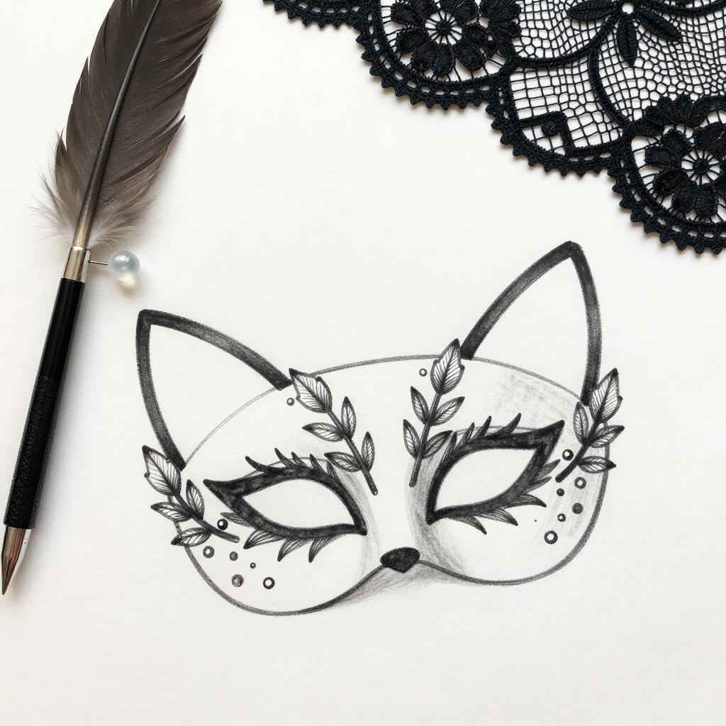Black ink illustration of a cat mask with leafy adornments and two feathered ends, lying on a flat surface. Black feather pen with a silver tip and translucent bead is to the left. Partial black lace fabric in the background.