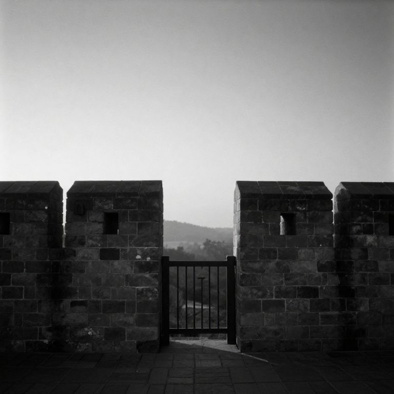 Black-and-white photograph of a stone fortress wall with tall, rectangular blocks and a central metal gate. The wall, positioned in the foreground, has a rough texture and small, rectangular windows. The gate, centered, is slightly open, revealing a faint, hazy landscape in the background. The sky is overexposed, creating a bright, almost white backdrop that contrasts with the dark stone. The ground is paved with large, rectangular stones. The overall mood is somber and mysterious, with strong contrasts and minimal detail beyond the fortress.