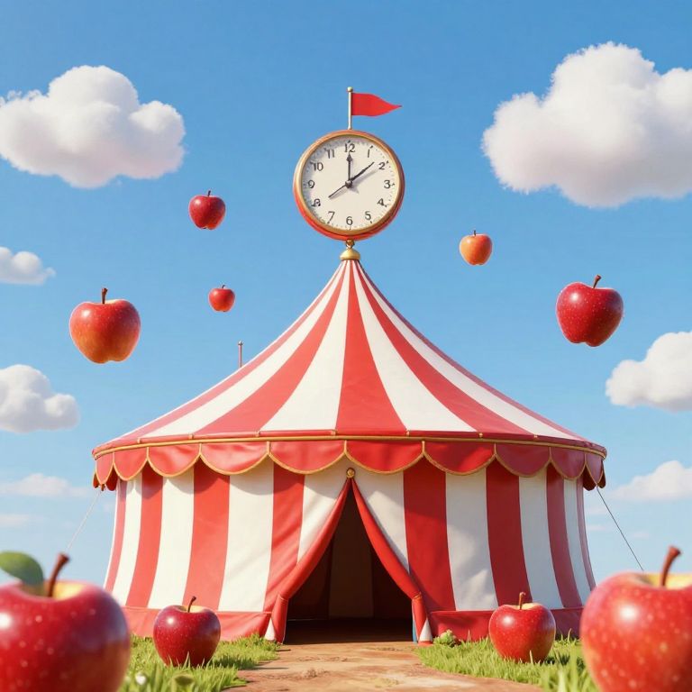 Photograph of a circus scene under a bright blue sky with white clouds. A black top hat with a red band sits on a striped red and white circus tent. Six apples, three red and three green, and two clocks, one red-faced and one white-faced, are suspended mid-air above the hat. The tent has red flags on top and string lights in the background. The apples and clocks appear to be juggling, creating a whimsical and magical effect. The image is vibrant and colorful, emphasizing the playful and festive atmosphere of the circus.