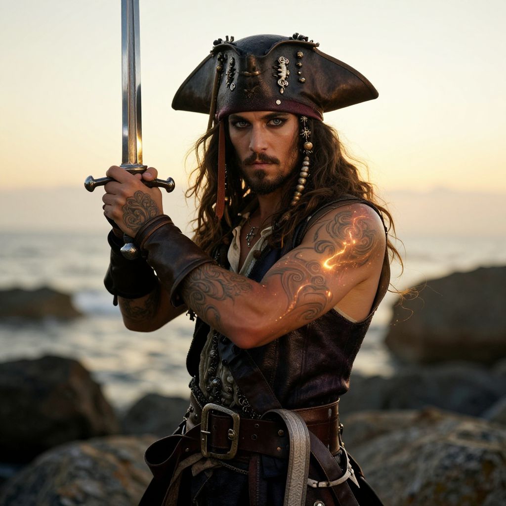 Photograph of a tattooed, long-haired pirate with a tricorn hat, holding a sword against a sunset ocean backdrop. Intense expression, detailed