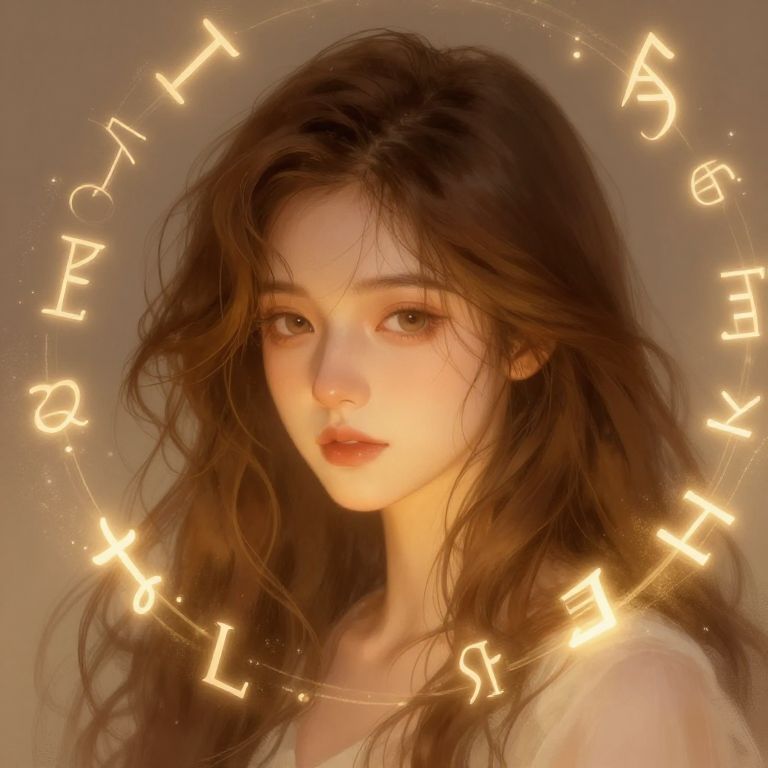 This digital artwork depicts a young woman with fair skin and long, wavy brown hair, looking directly at the viewer with a slightly pensive expression. Her soft, delicate features are illuminated by a warm, glowing light. Surrounding her head is a circular neon-like outline with the zodiac signs in glowing yellow letters, arranged in a clockwise sequence. She wears a simple, white sleeveless top. The background is a muted, gradient gray, allowing the glowing signs and her face to stand out prominently. The image has a soft, ethereal quality, blending realistic and fantasy elements.