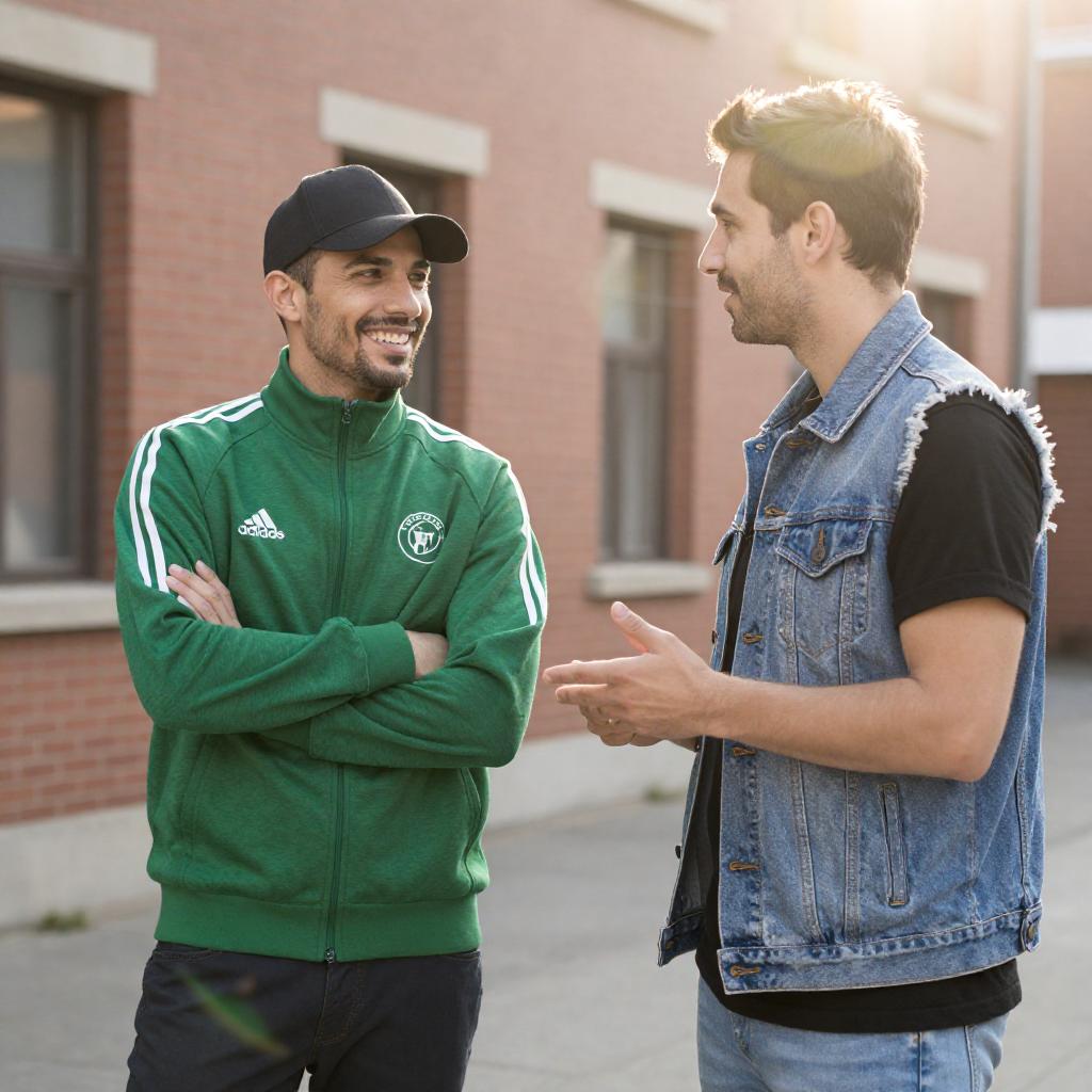 Photograph of two men standing outside a brick building. Left man in green sports jacket and cap, smiling, arms crossed. Right man in blue denim vest, brown hair, gesturing with right hand. Sunlight lens flare in background.