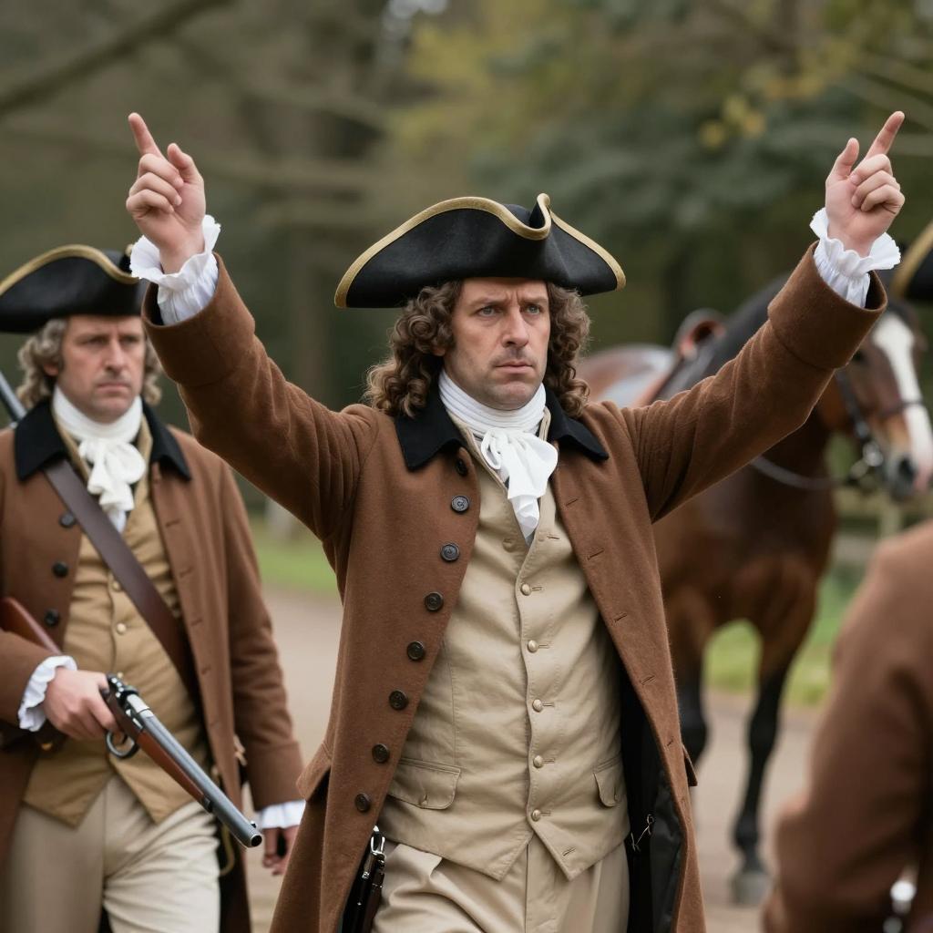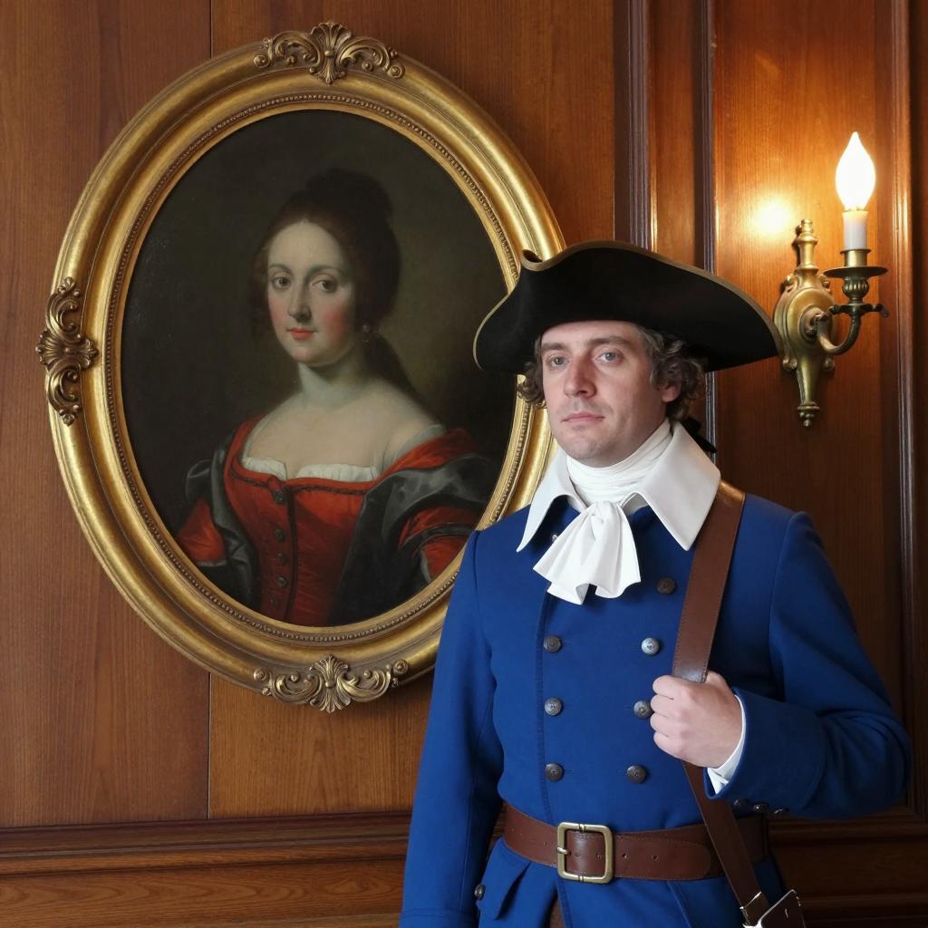 A man dressed in an 18th century-style blue coat with a large black tricorn hat, white collar, and brown belt stands next to an oval framed vintage portrait of a pale woman with dark hair, red dress, and white collar. The scene is set against a polished wooden wall with a brass wall sconce holding a lit candle.