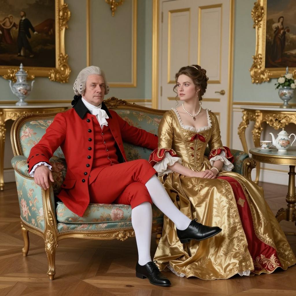 Man in 18th Century Costume Standing Beside Vintage Portrait