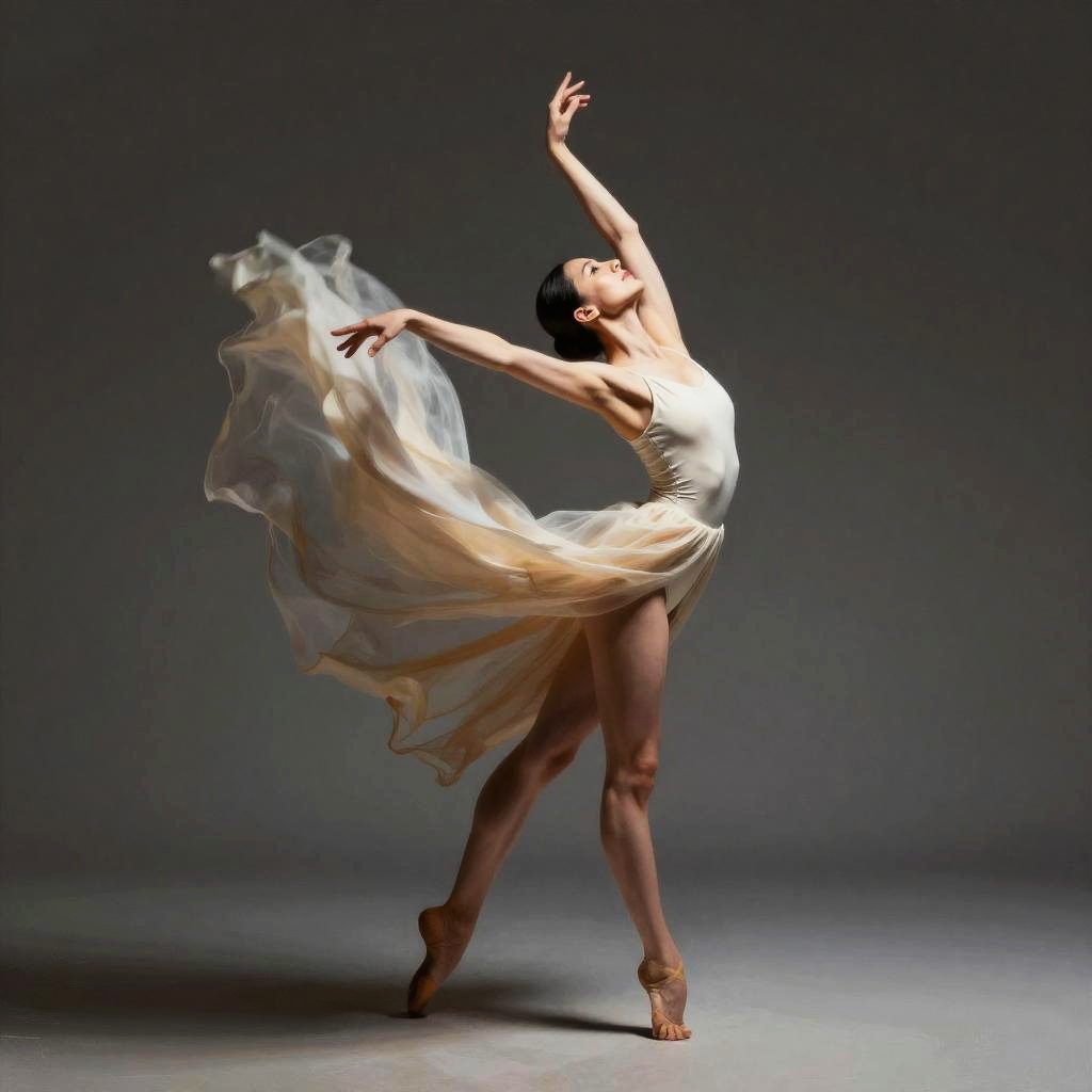 Digital painting of an elegant ballerina with elongated limbs captured in a dynamic pose. The dancer wears a flowing, semi-transparent beige dress, highlighted by dramatic lighting and subtle motion blur. The artwork emphasizes grace, movement, and fluidity against a neutral dark background.