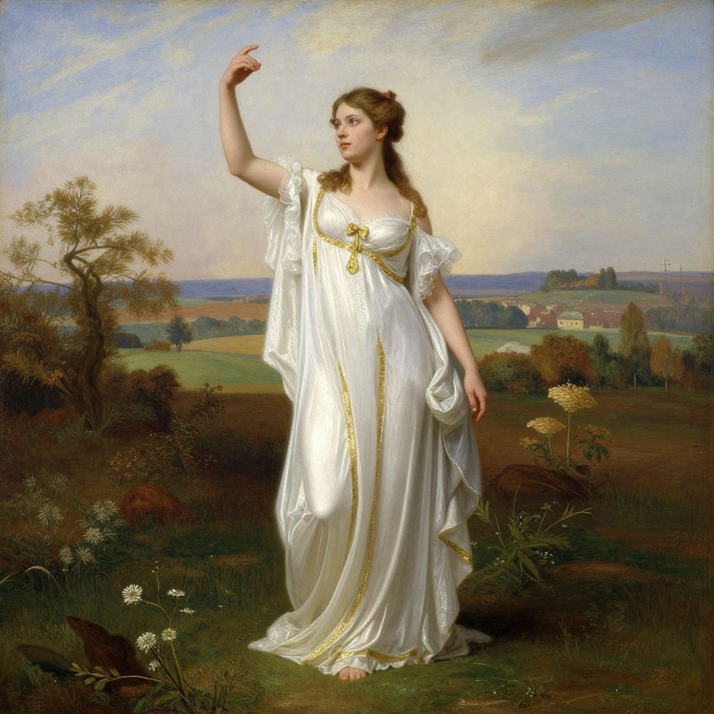 Classical painting of a fair-skinned woman with brown hair in a white, gold-trimmed Greek-style gown, standing in a lush, tree