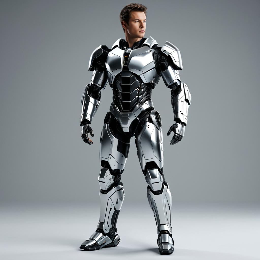 Elliot robot, photorealistic CGI, male, handsome, short brown hair, standing, full body, futuristic silver and black robotic armor, muscular build, detailed armor plates, metallic ure, light reflections, neutral grey background, sci-fi, realistic lighting, 3D-rendered, realistic human-robot hybrid, symmetrical composition, slight side profile, confident expression, sleek design, high-tech aesthetics, sci-fi character, realistic rendering, high detail, no additional objects, centered figure