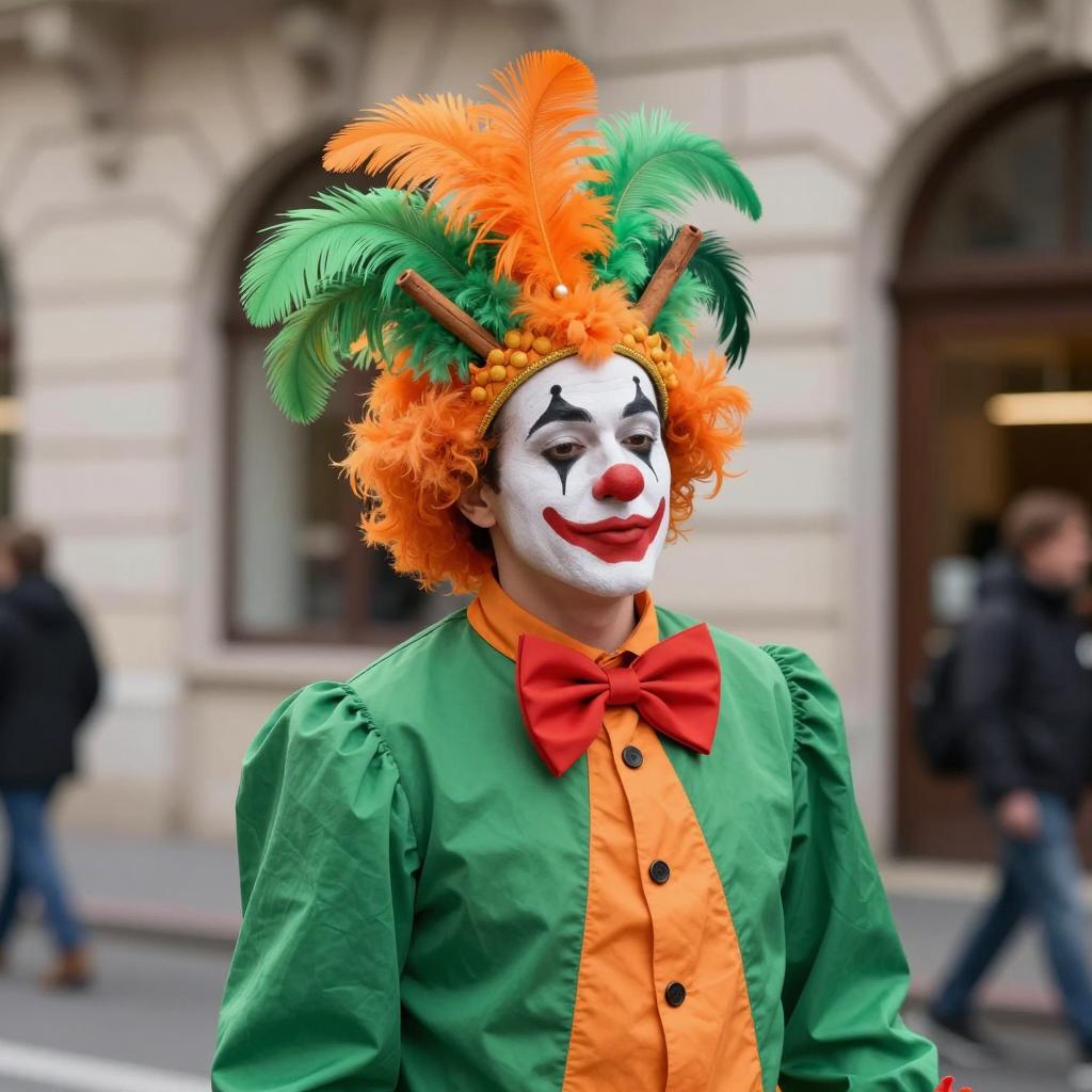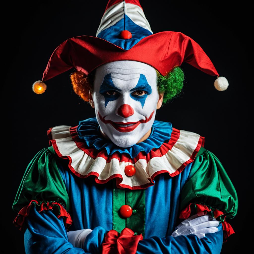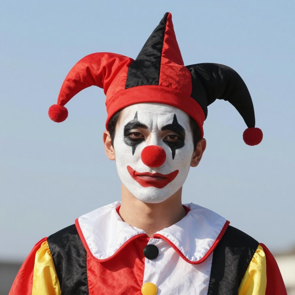 Harlequin costume male, digital photo of a person in a clown costume, jester hat with black and red, white face paint with black circles around eyes, red nose, close-up, daytime, clear blue sky background, person looking directly at camera, clown costume with red, black, white, and yellow patches, buttons on jacket, hard lighting, realistic style, slightly exaggerated facial features, slightly serious expression