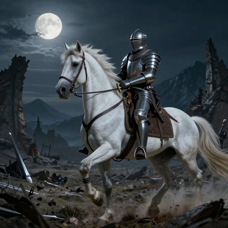 Photorealistic digital artwork of a knight in shiny silver armor, riding a white horse, charging through a battlefield with armored soldiers under a stormy sky