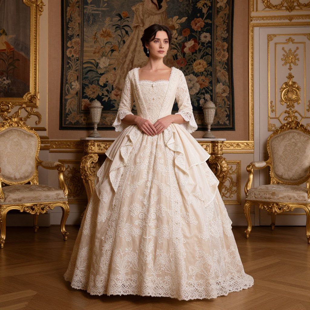 Elegant woman wearing a Victorian-inspired ball gown adorned with intricate floral lace detailing, standing gracefully in a grand European palace room, surrounded by ornate furnishings, a floral tapestry, and warm golden lighting.