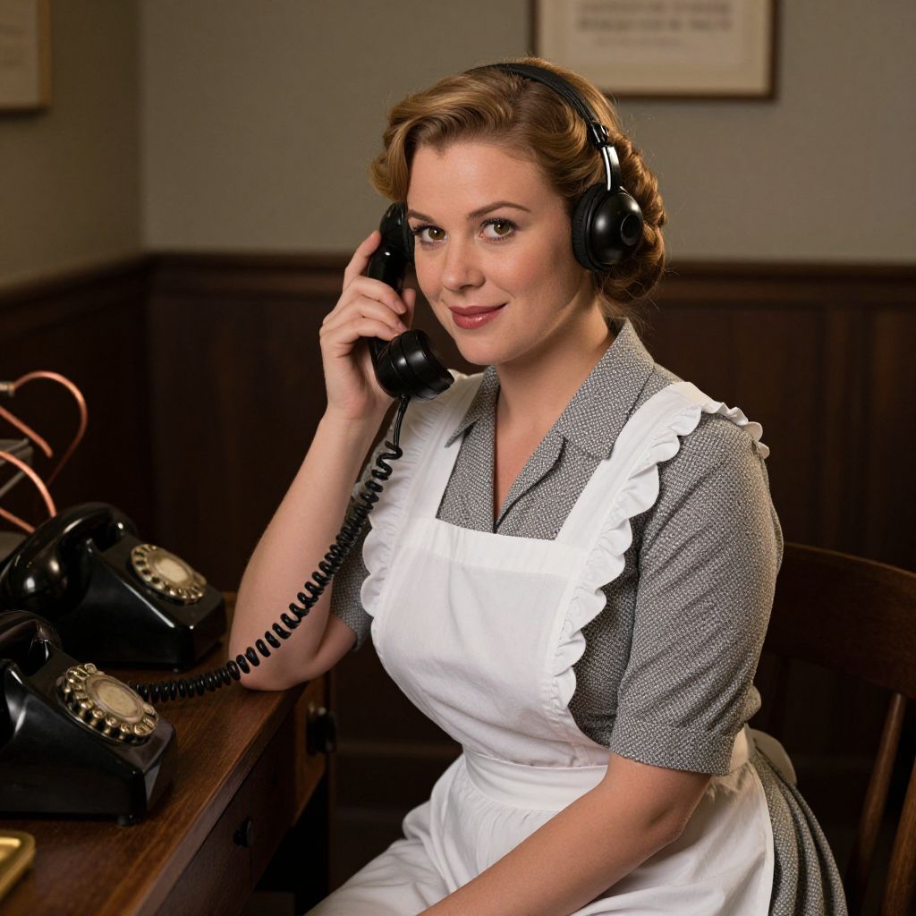 Photograph of a light-skinned woman with short, wavy brown hair, wearing a gray, short-sleeved, patterned dress and a white apron. She is sitting at a wooden desk, holding a black rotary telephone to her ear with her right hand, wearing black over-ear headphones. Her makeup is subtle, with red lipstick. The background features dark wooden wainscoting and blurred framed documents on the wall. The image has a vintage, mid-20th-century style, with warm lighting highlighting the woman's face and attire. Another black rotary phone is visible on the desk to her left.