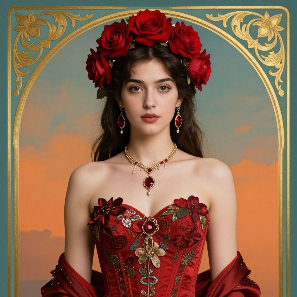 Elegant Art Nouveau portrait featuring a woman adorned with vibrant red roses atop her dark hair, wearing a richly detailed red corset embellished with floral patterns, complemented by a necklace and matching earrings, all framed within an ornate golden border against a teal and orange backdrop.