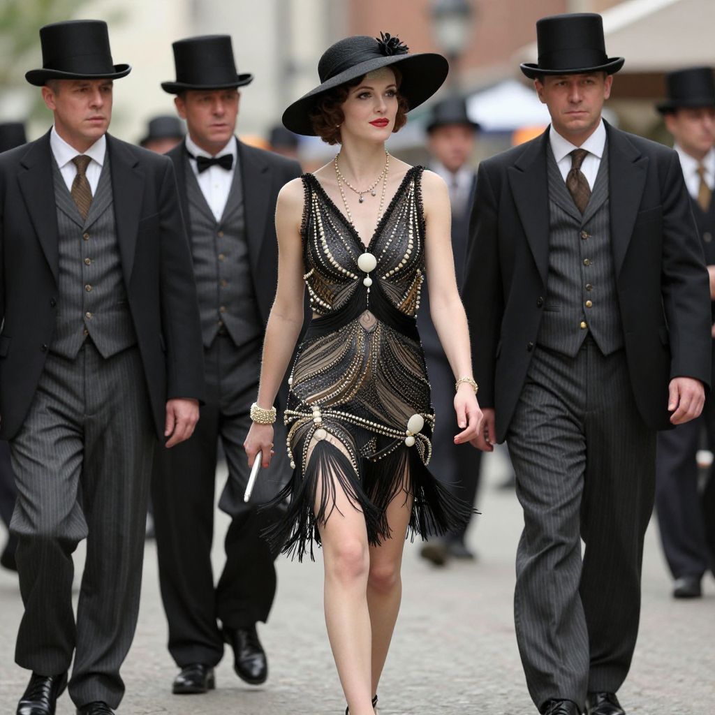 Photograph of a stylish scene featuring a fair-skinned woman with short, dark hair, wearing a black, sleeveless fringe dress adorned with silver beads and a large central jewel. She also wears a wide-brimmed black hat with a decorative feather and red lipstick. Flanking her are four men in black, pinstriped three-piece suits and top hats, walking in a row. The woman holds a black clutch in her right hand. The background is blurred, suggesting an urban setting with indistinct buildings. The overall style evokes a vintage, 1920s-inspired fashion.