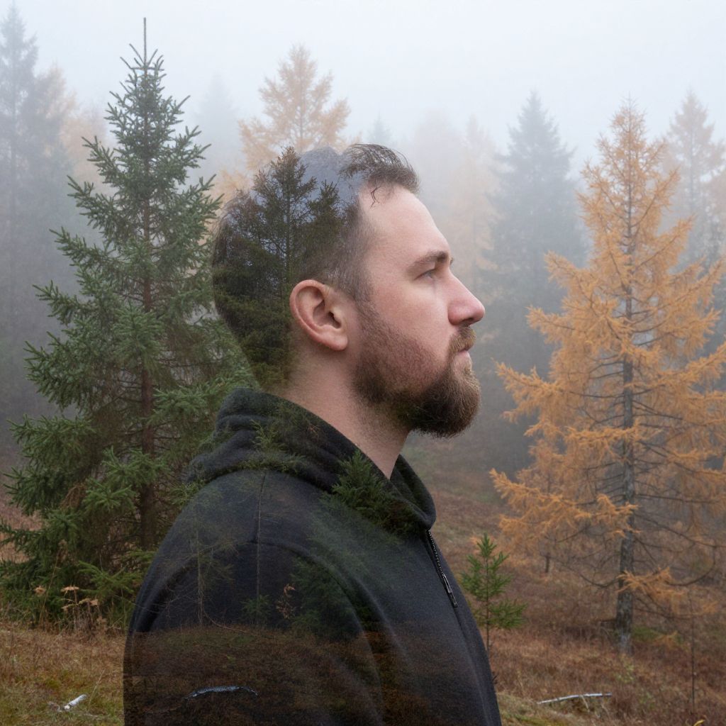 Photograph of a bearded man in profile, wearing a black hoodie, standing in a misty forest with evergreen and autumn trees.