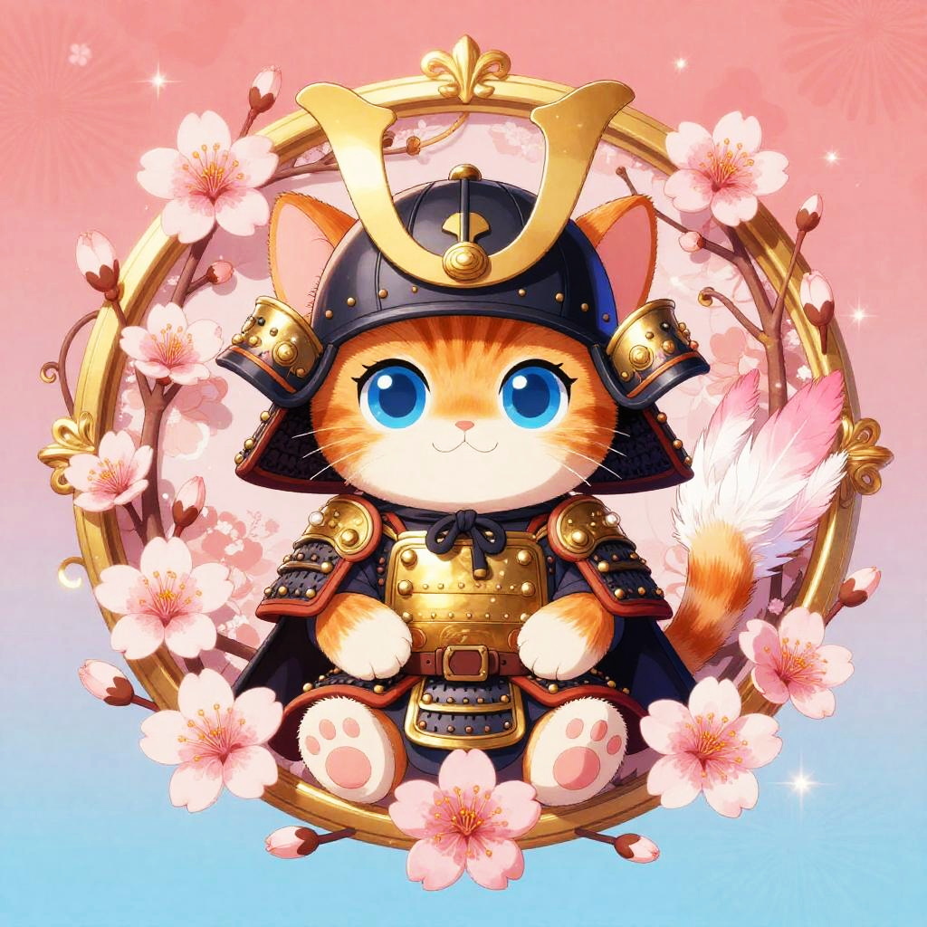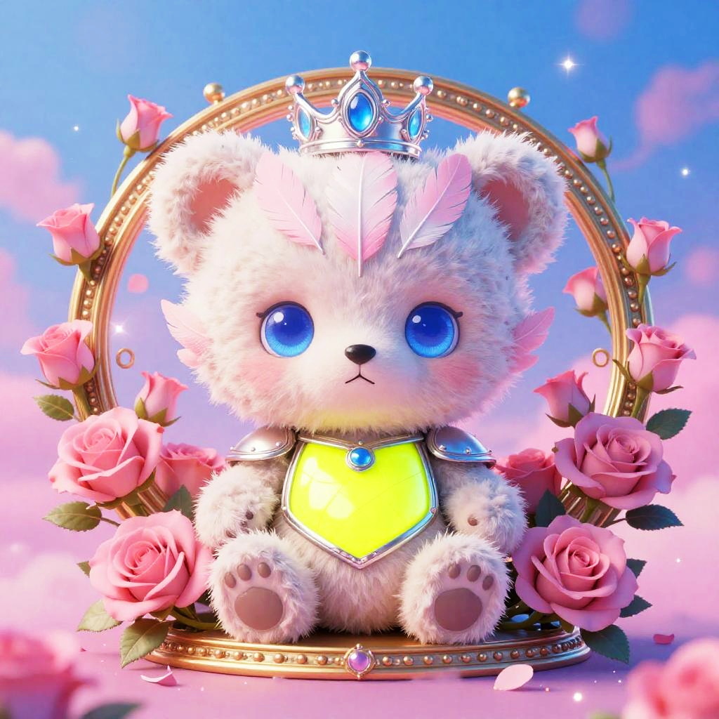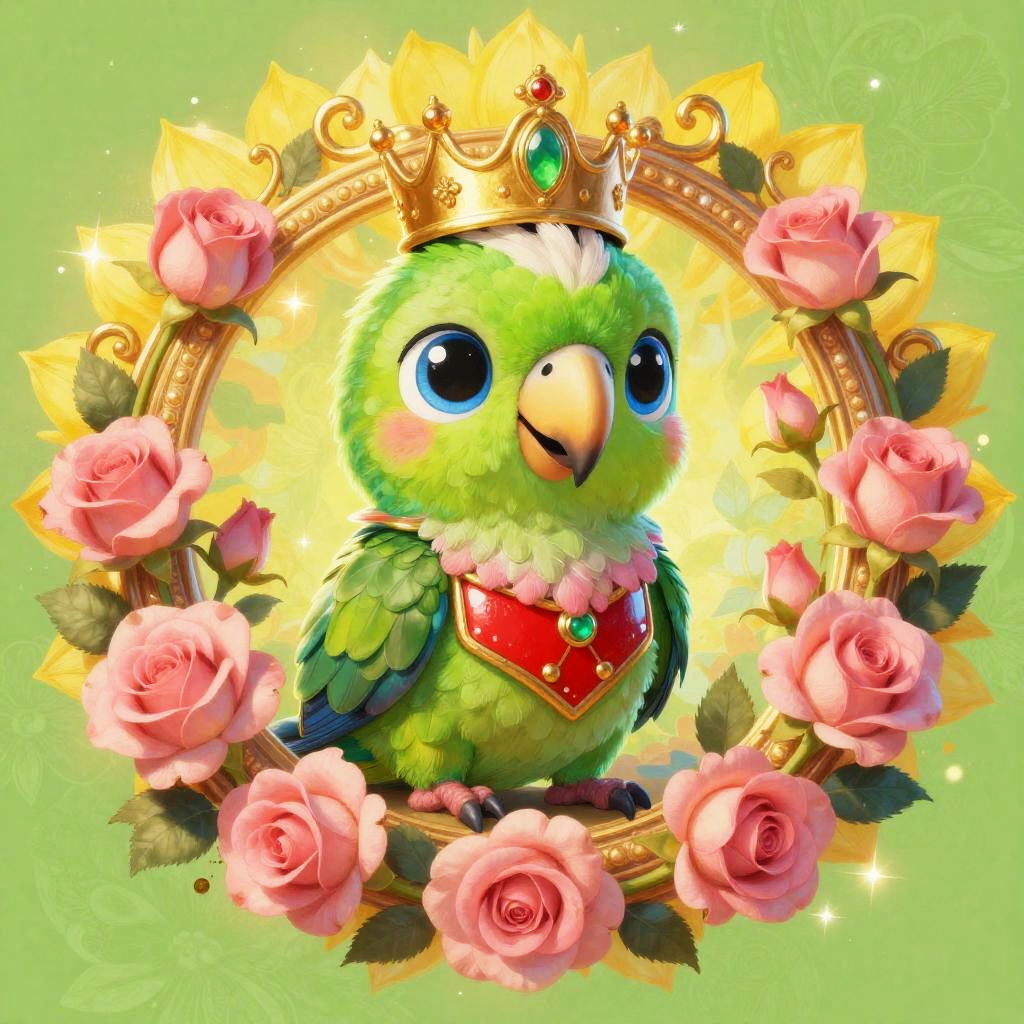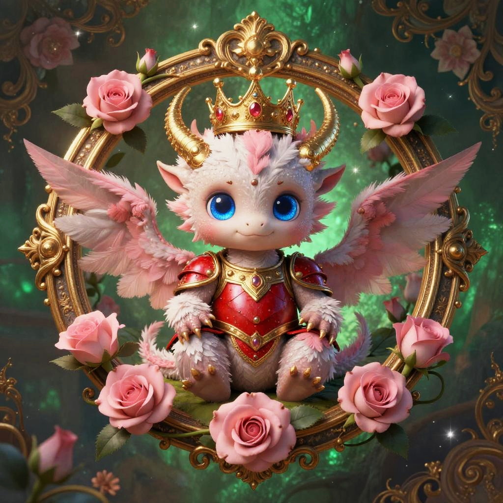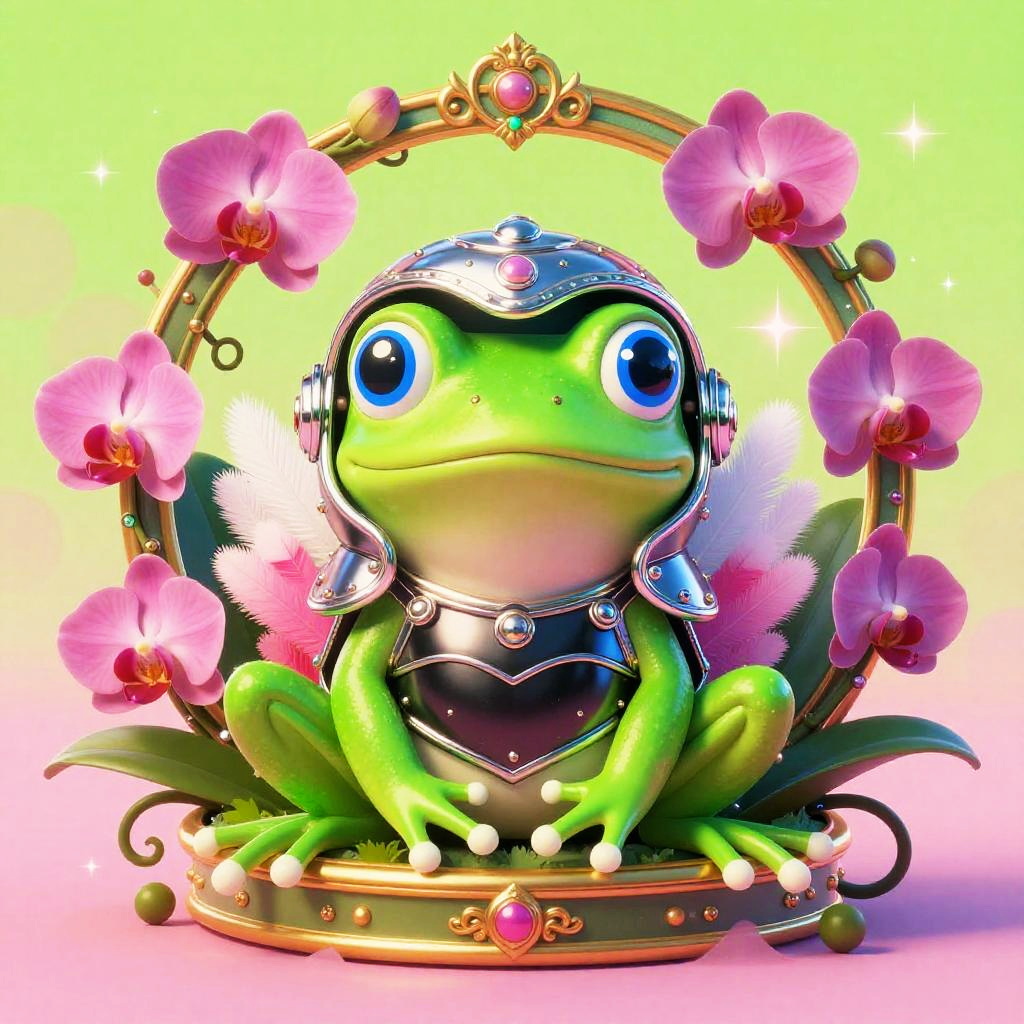 Digital retro 80s arcade illustration of a chibi neon frog with huge blue eyes and fluffy white and pink feathers. It wears an ornate chrome helmet and lacquered black chest armor, seated inside a gilded circular medallion overflowing with fuchsia orchids and curling vines. Background glows in a vibrant lime green and neon pink haze with floral patterns and gentle sparkles. Innocent, endearing expression, whimsical fantasy tone, high detail, soft bloom, delicate rim light, symmetrical composition, storybook charm.