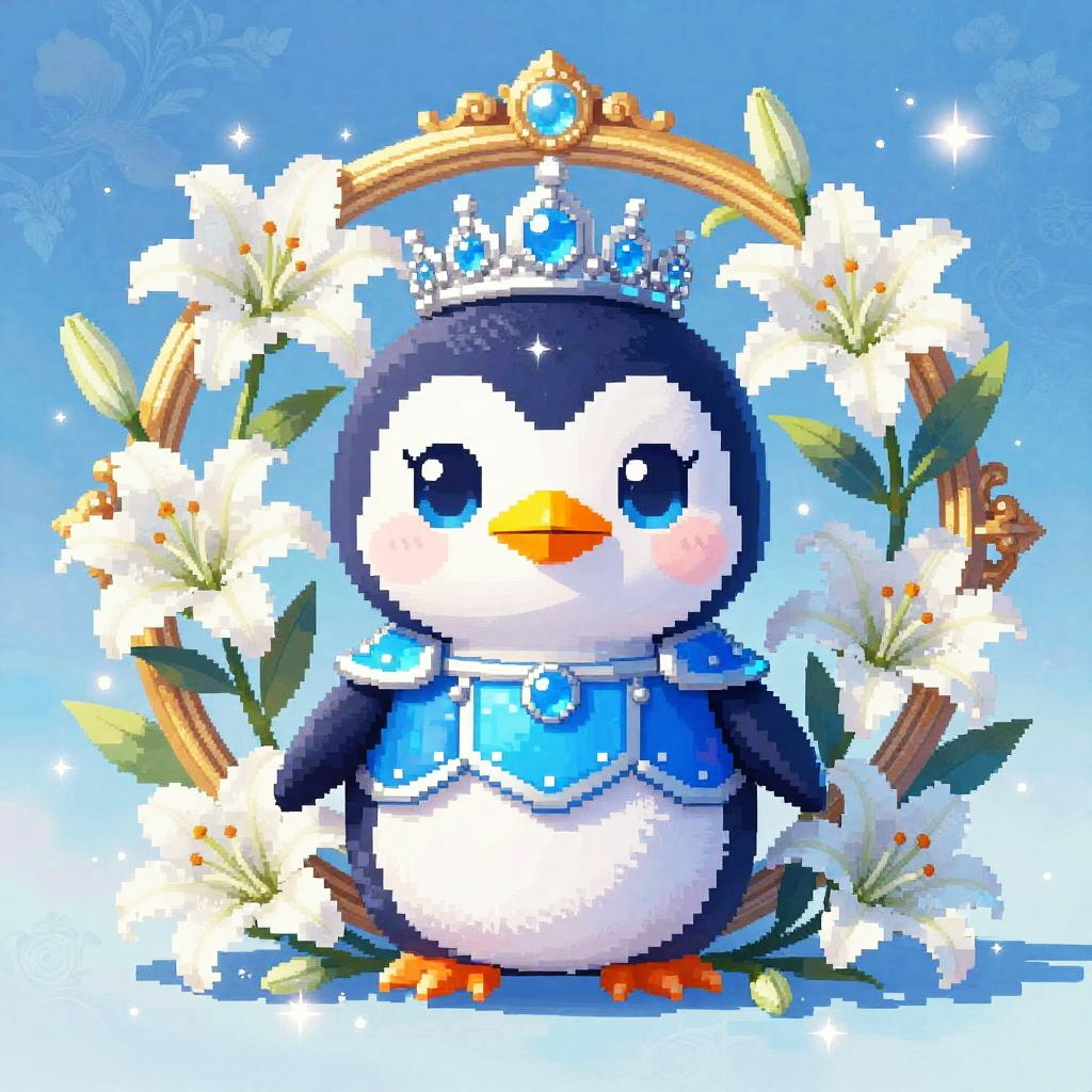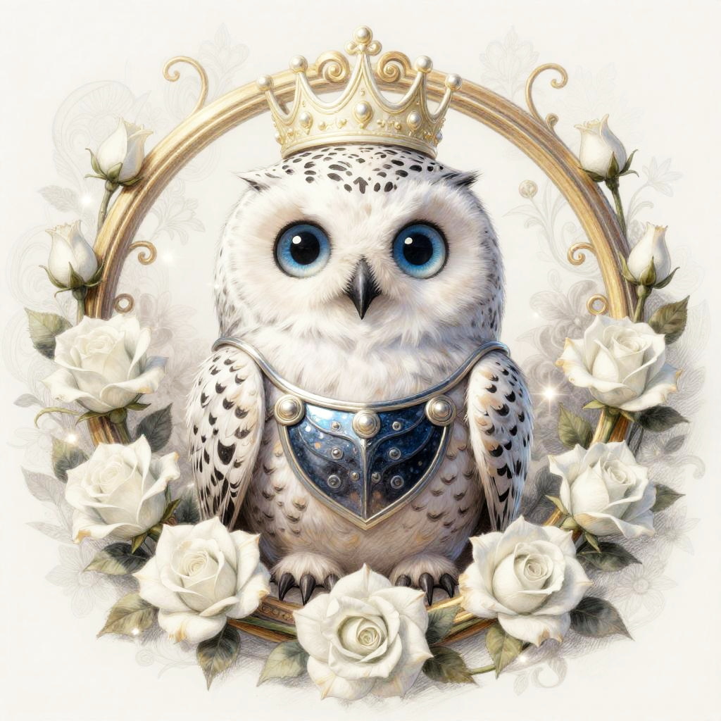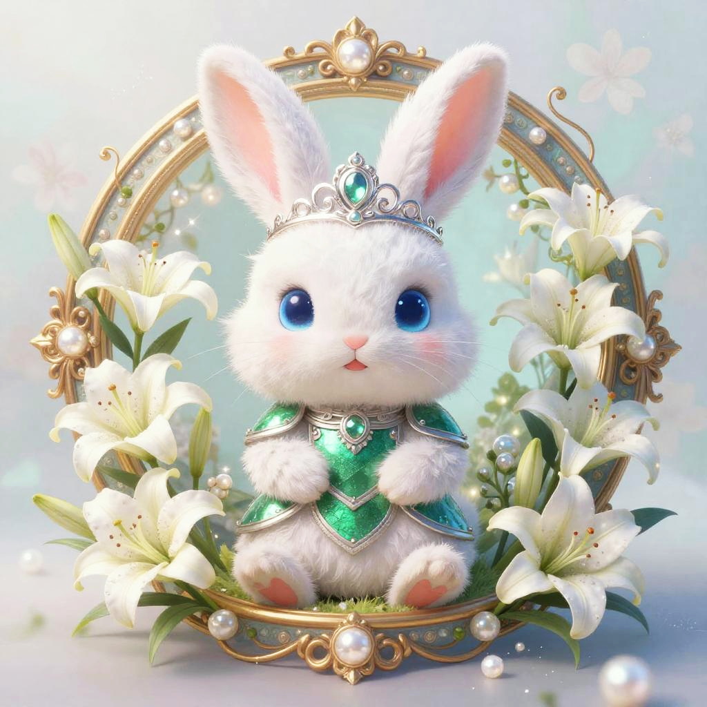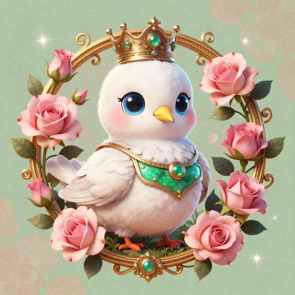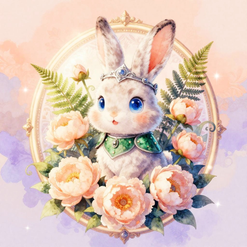 Digital retro 80s arcade illustration of a chibi neon frog with huge blue eyes and fluffy white and pink feathers. It wears an ornate chrome helmet and lacquered black chest armor, seated inside a gilded circular medallion overflowing with fuchsia orchids and curling vines. Background glows in a vibrant lime green and neon pink haze with floral patterns and gentle sparkles. Innocent, endearing expression, whimsical fantasy tone, high detail, soft bloom, delicate rim light, symmetrical composition, storybook charm.