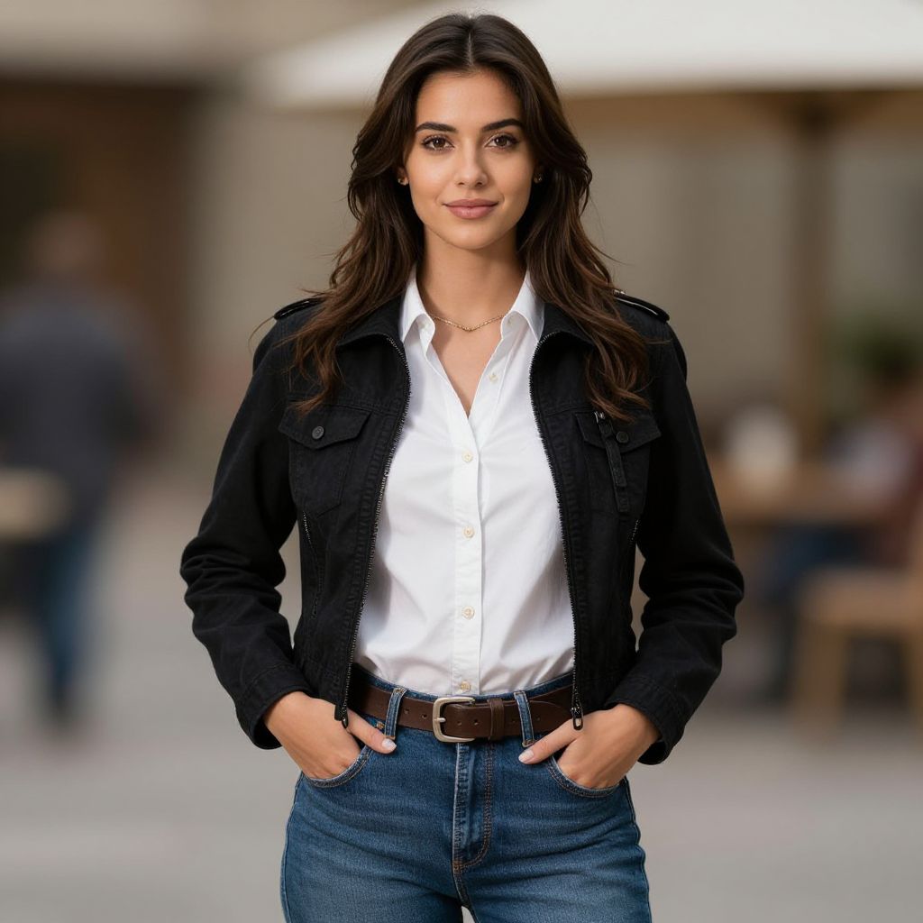 Photograph of a confident woman standing in a desert. She has long dark hair, wears a grey vest over a black shirt, dark jeans, and multiple bracelets. Her brown leather jacket is unzipped, and she has a brown belt with a buckle. Behind her is a rugged, military-style Jeep, and a small, weathered building is in the background. The desert is sandy and barren.