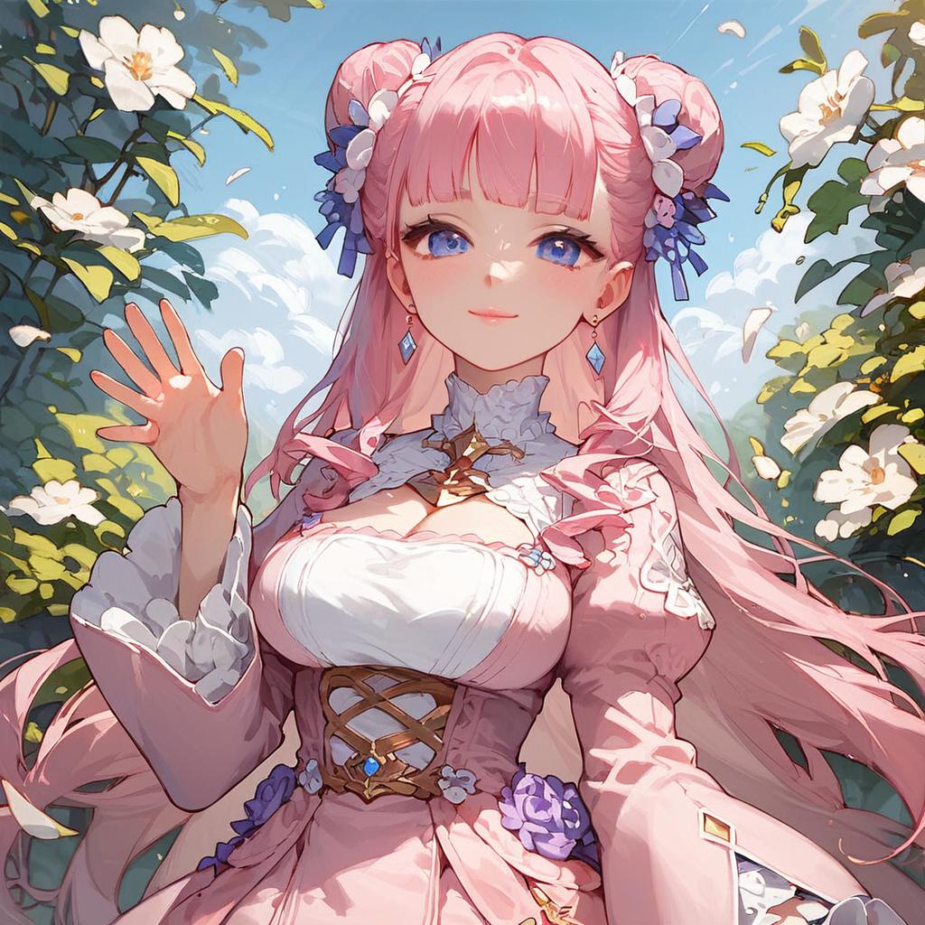 Score_9, score_8_up, score_7_up, score_6_up, score_5_up, score_4_up, rating_questionable, source_anime, digital illustration, pixiv, fanbox, uncensored, , official art, 1girl, female, euphemia li britannia, pink hair, long hair, purple eyes, double bun, pink dress, long sleeves, cleavage cutout, flower, choker, flower choker, waving, upper body, light smile, outdoors, blush, looking at viewer, cowboy shot, colorful, vivid, 5 fingers